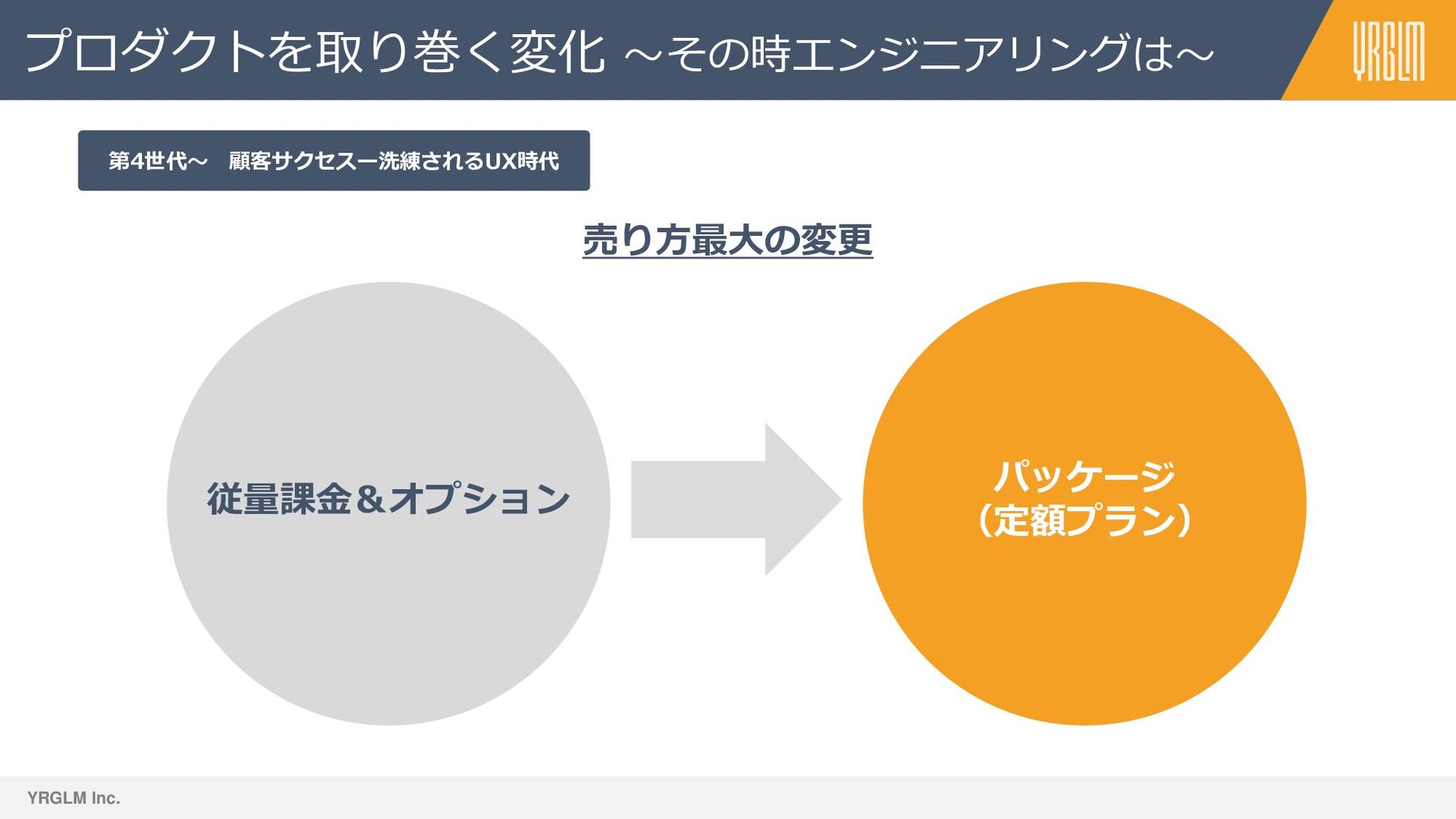 YRGLM Inc. プロダクトを取り巻く変化 ~その時エンジニアリングは~ 売り方最大の変更 従量課金&オプション パッケージ (定額プラン) 第4世代~ 顧客サクセスー洗練されるUX時代