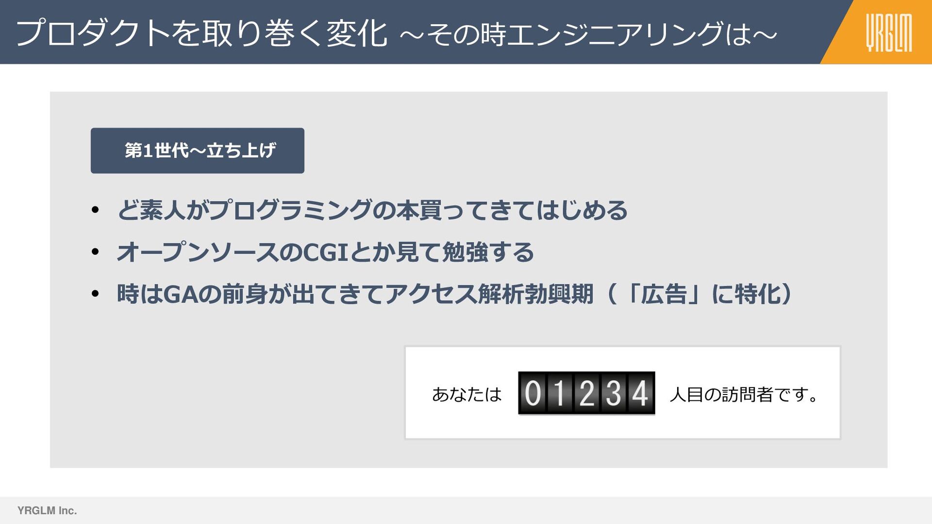 YRGLM Inc. あなたは 人目の訪問者です。 • ど素人がプログラミングの本買ってきてはじめる • オープンソースのCGIとか見て勉強する • 時はGAの前身が出てきてアクセス解析勃興期(「広告」に特化)