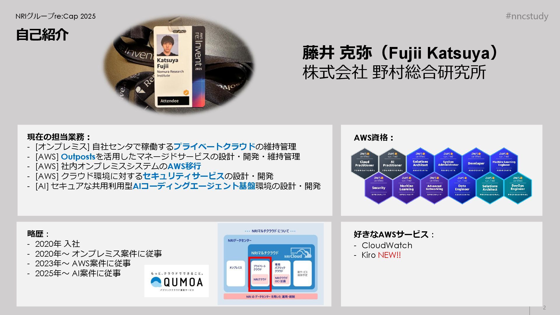 #nncstudy 自己紹介 NRIグループre:Cap 2025 現在の担当業務: - [オンプレミス] 自社センタで稼働するプライベートクラウドの維持管理 - [AWS]