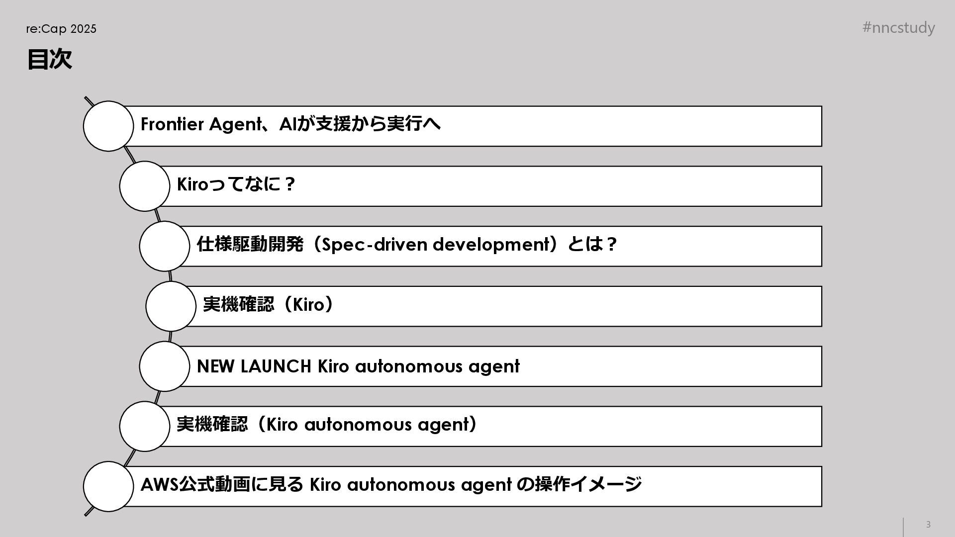 #nncstudy 目次 re:Cap 2025 Frontier Agent、AIが支援から実行へ Kiroってなに? 仕様駆動開発(Spec-driven development)とは? 実機確認(Kiro)