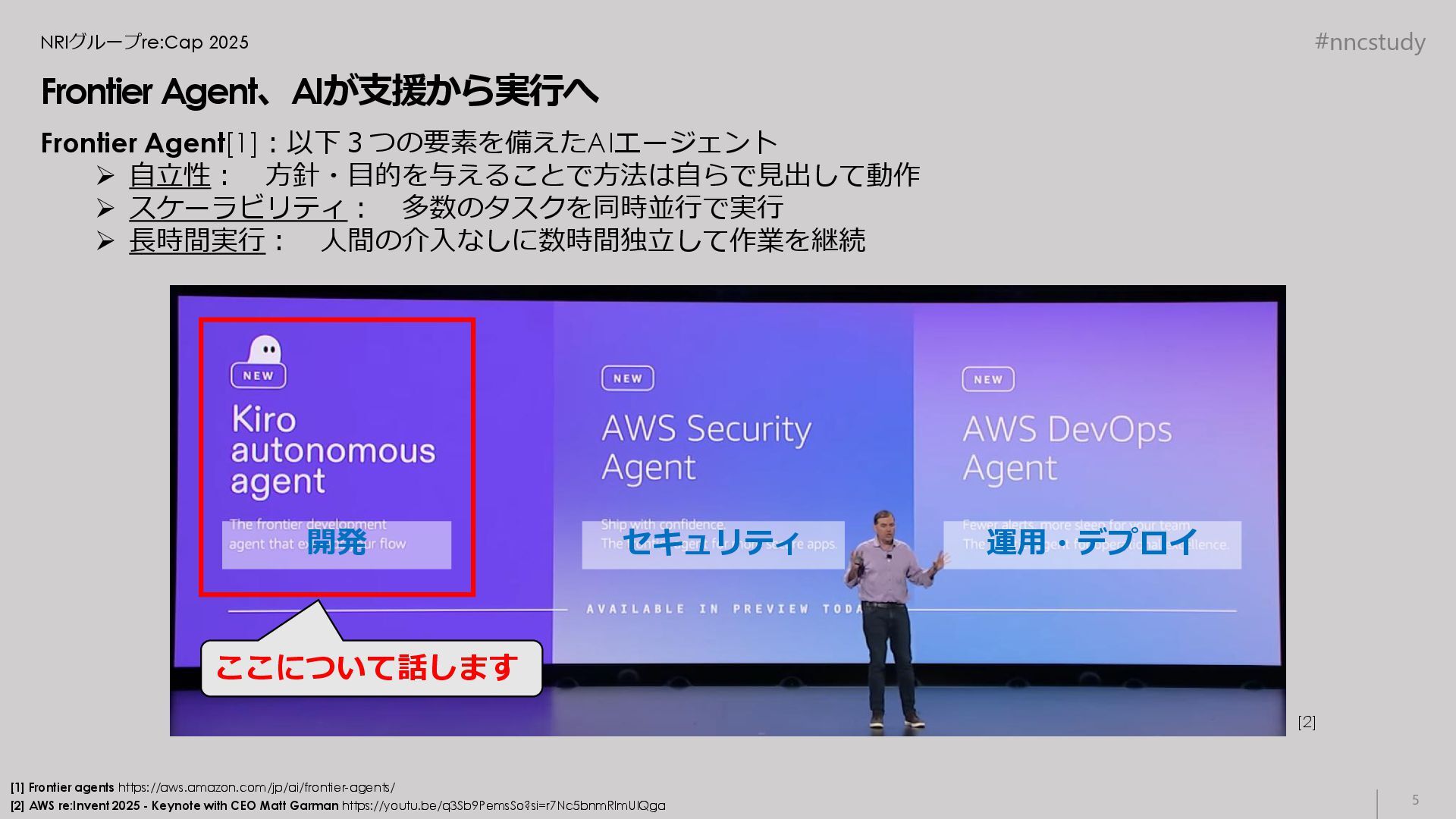 Keynote with CEO Matt Garman https://youtu.be/q3Sb9PemsSo?si=r7Nc5bnmRlmUIQga [1] Frontier agents https://aws.amazon.com/jp/ai/frontier-agents/ Frontier Agent[1]:以下3つの要素を備えたAIエージェント ➢ 自立性: 方針・目的を与えることで方法は自らで見出して動作 ➢ スケーラビリティ: 多数のタスクを同時並行で実行 ➢ 長時間実行: 人間の介入なしに数時間独立して作業を継続 開発 セキュリティ 運用・デプロイ [2] 4