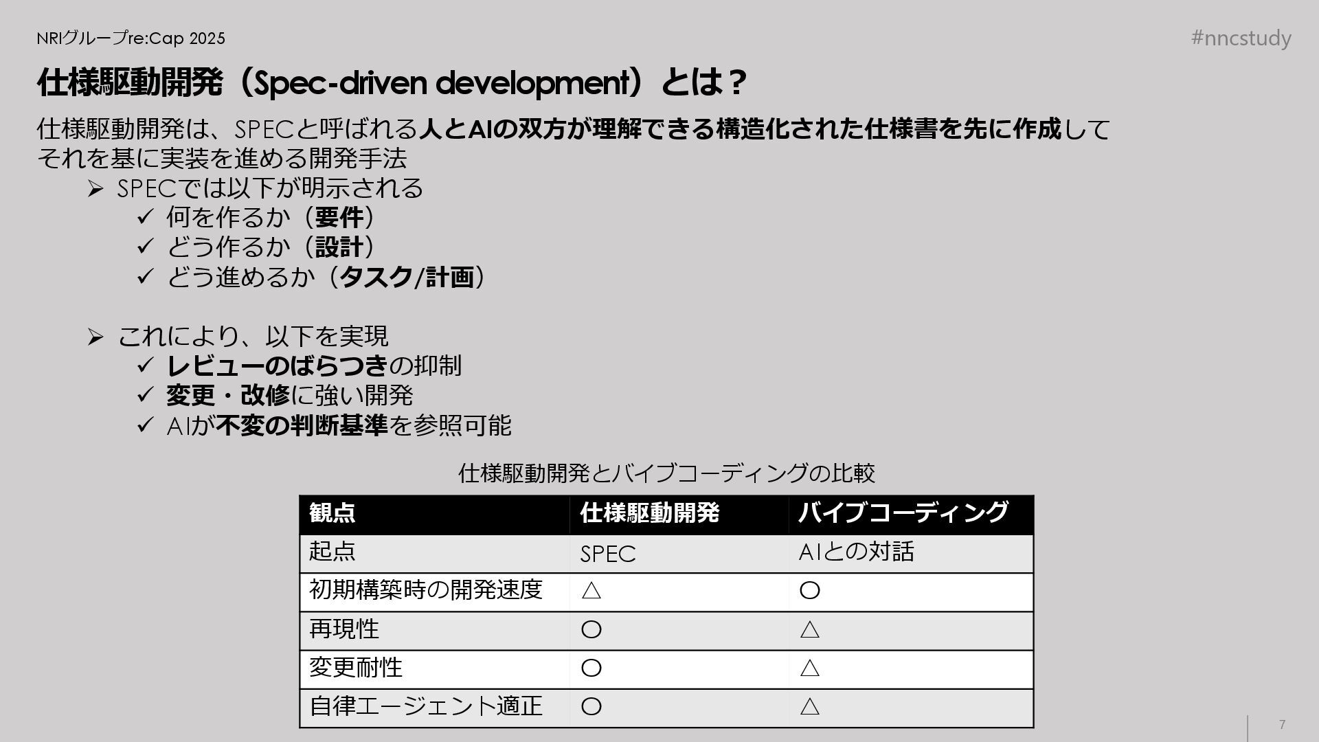 #nncstudy NRIグループre:Cap 2025 仕様駆動開発(Spec-driven development)とは? 仕様駆動開発は、SPECと呼ばれる人とAIの双方が理解できる構造化された仕様書を先に作成して それを基に実装を進める開発手法 ➢ SPECでは以下が明示される ✓