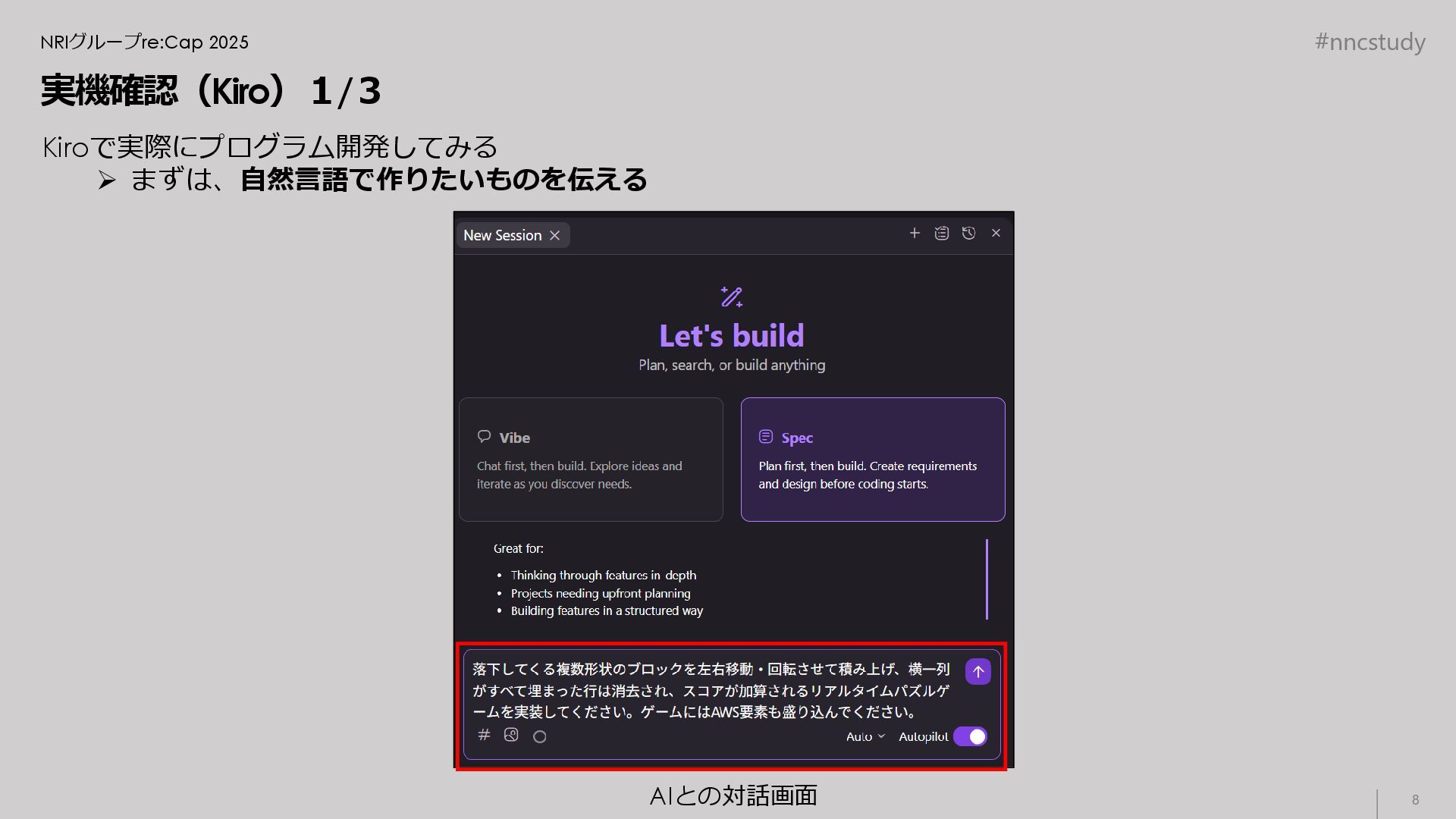 #nncstudy NRIグループre:Cap 2025 実機確認(Kiro)1/3 Kiroで実際にプログラム開発してみる ➢ まずは、自然言語で作りたいものを伝える AIとの対話画面 8