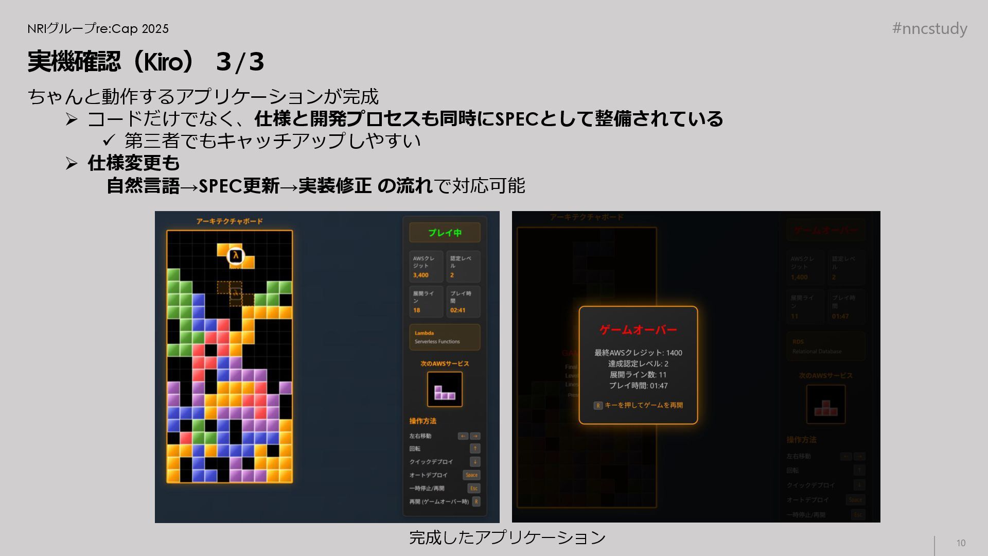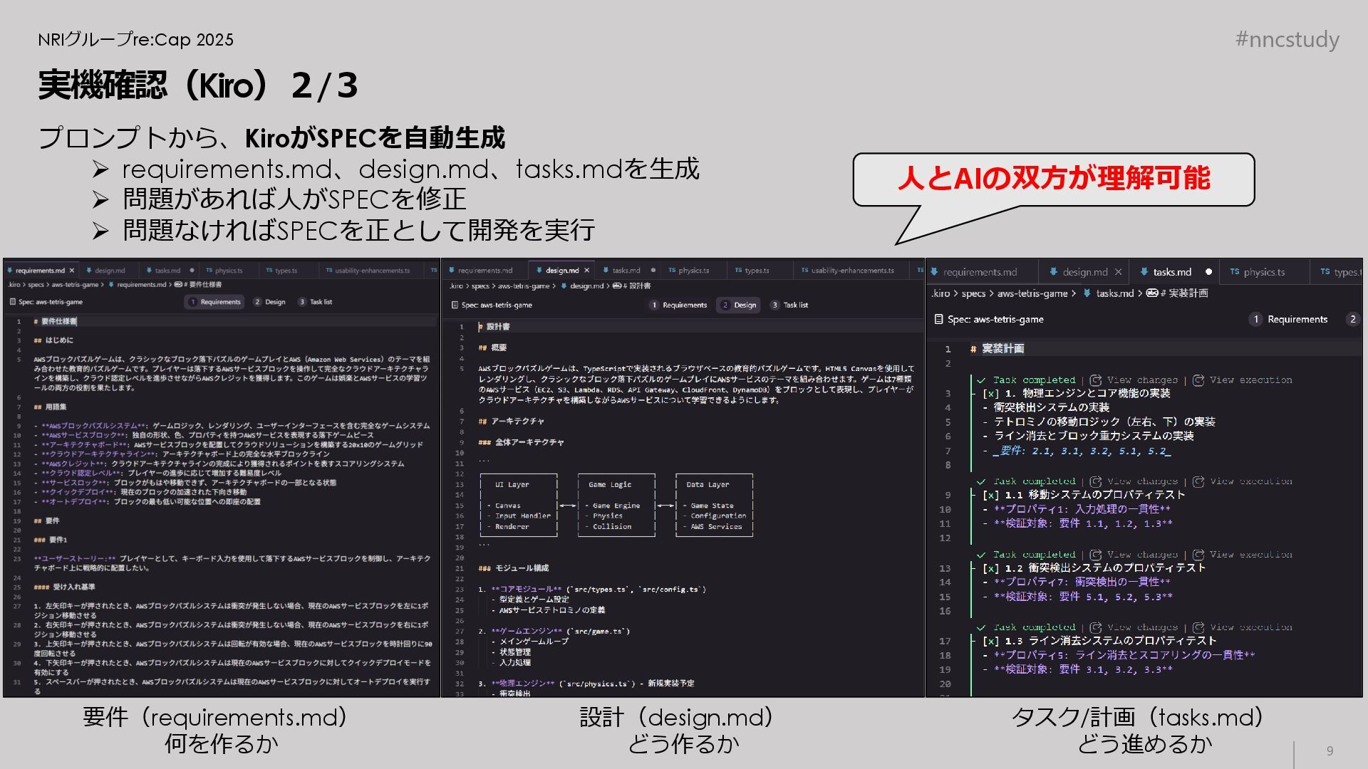 #nncstudy NRIグループre:Cap 2025 実機確認(Kiro) 3/3 ちゃんと動作するアプリケーションが完成 ➢ コードだけでなく、仕様と開発プロセスも同時にSPECとして整備されている ✓ 第三者でもキャッチアップしやすい