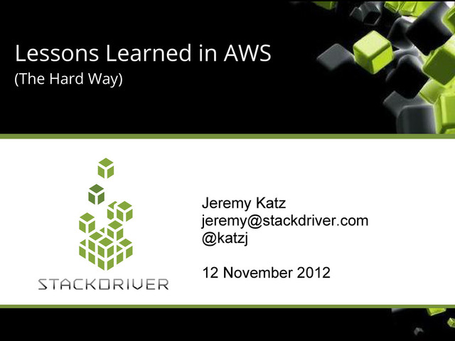 Cloudfront, etc) to help mitigate failures • Distribute your application across Availability Zones • Use IAM. ◦ Don't share master keys with everyone in your org • Don't do things by hand ◦ Rich APIs are available for everything with bindings for every language you might want ◦ If using the console, you are setting yourself up for future problems • Automate setup of instances too ◦ chef, puppet, cfengine, salt, ansible, fabric, bash ◦ It doesn't matter. Pick one.