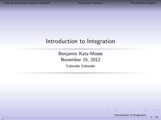 Integral Quick Check Suppose you are slicing an 11 inch long carrot REALLY thin from the greens end to the tip of the root. If each slice has a circular cross section f (x) = π(r(x))2 for each x between 0 and 11, and we make our cuts at x1, x2, x3, ... , xn, then a good approximation for the volume of the carrot is 1 n i=1 f (xi )xi 2 n i=1 [f (xi+1) − f (xi )]xi 3 n i=1 f (xi )[xi+1 − xi ] 11 / 14 Introduction to Integration