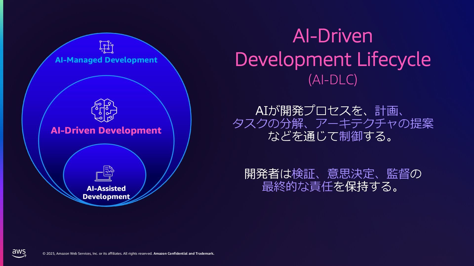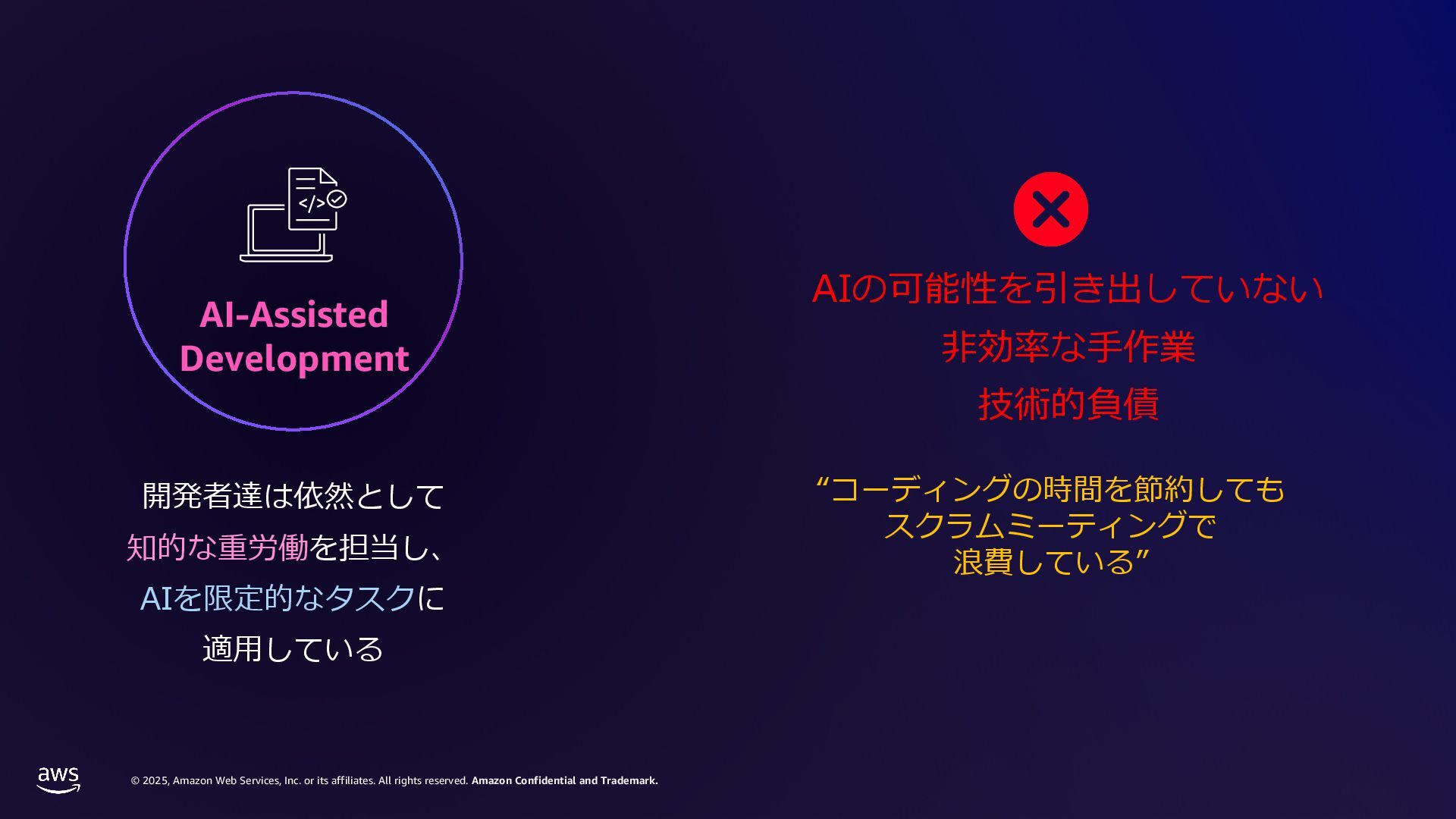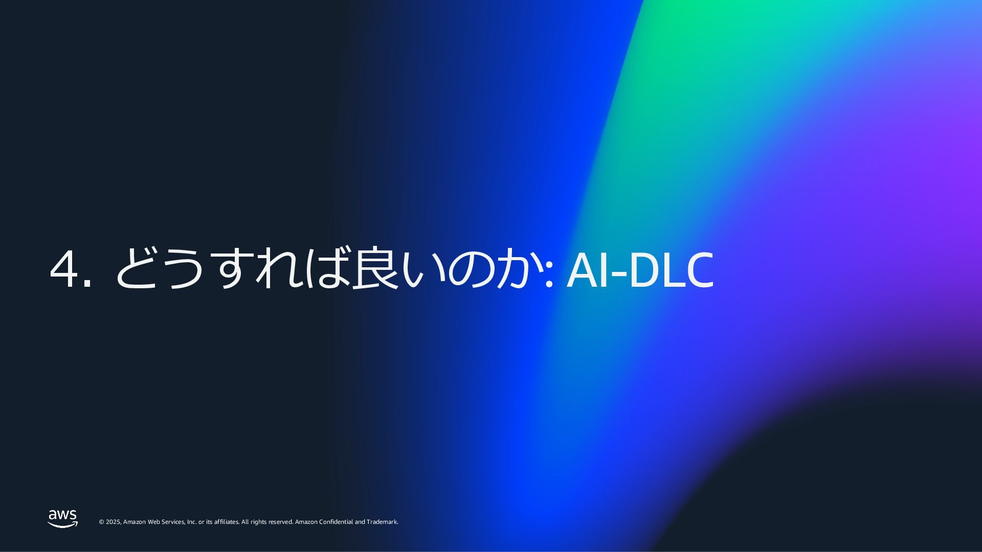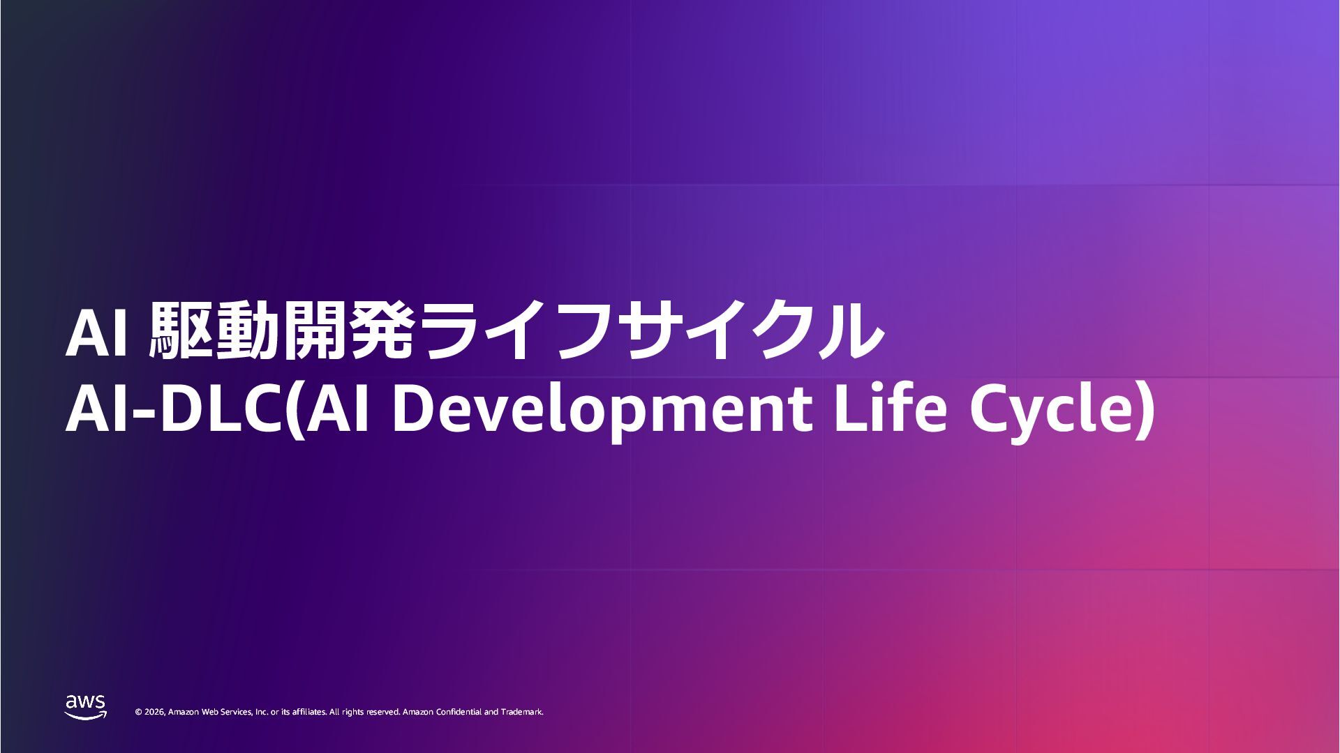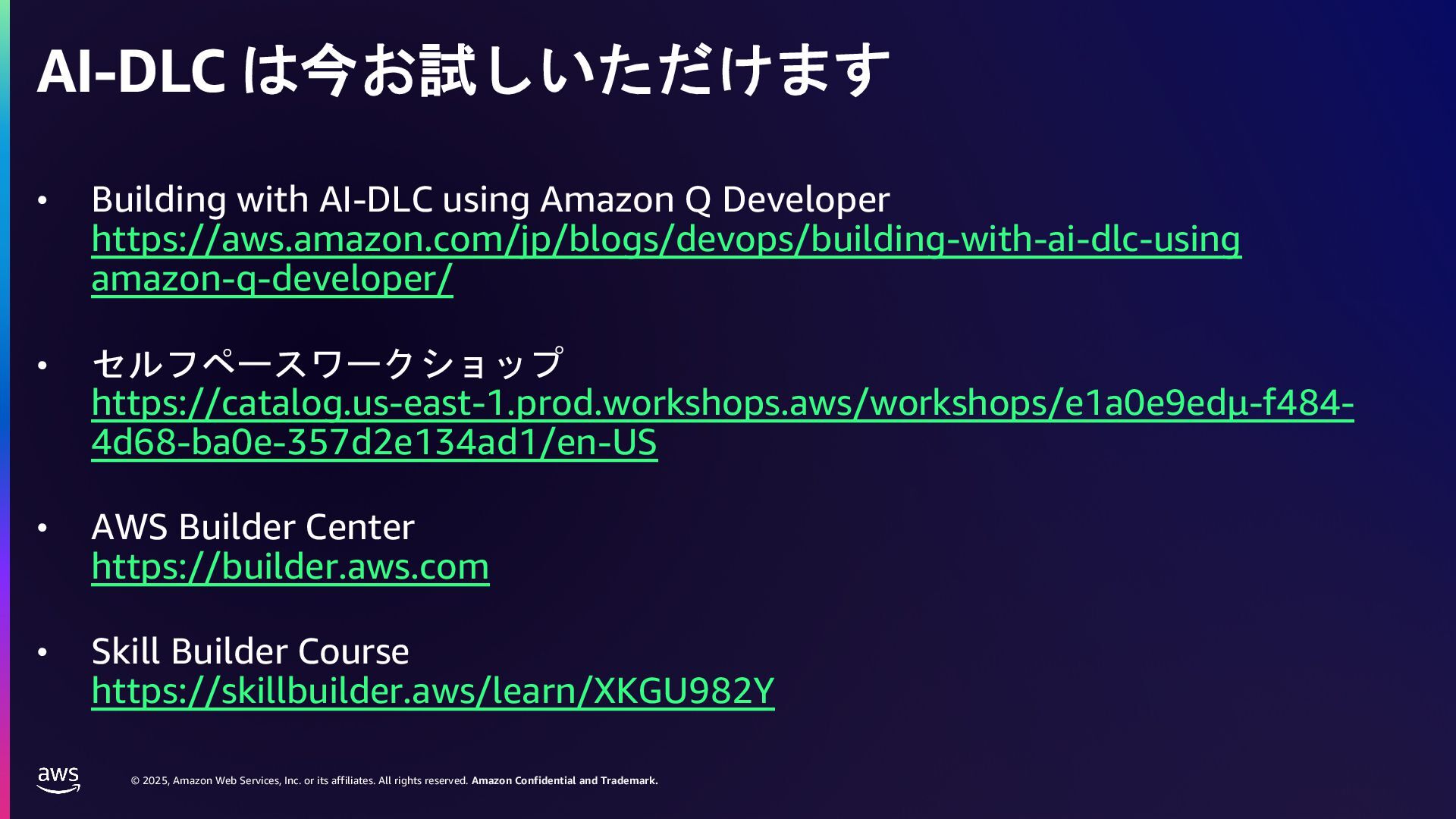 rights reserved. Amazon Confidential and Trademark. AI-DLC: ダイナミックなチームコラボレーション AI がルーティンタスクを処理する⼀⽅で、チームはリアルタイムでの問題解決、創造的思考、 迅速な意思決定のために、コラボレーションしやすい環境で協⼒します。この孤⽴した作業から 活気のあるチーム作業への転換は、イノベーションと成果物の提供を加速します。 - AI 駆動開発ライフサイクル:ソフトウェアエンジニアリングの再構築 Biz Dev これまで 要件/PBI スプリント/ 開発 ソフトウェア レビュー/ テスト :⼈間の作業待ち時間 要件/PBI ソフトウェア AI-DLC Biz Dev 問題解決/創造的な意思決定 AIが全て作成-> ⼈間の作業待ち時間なし