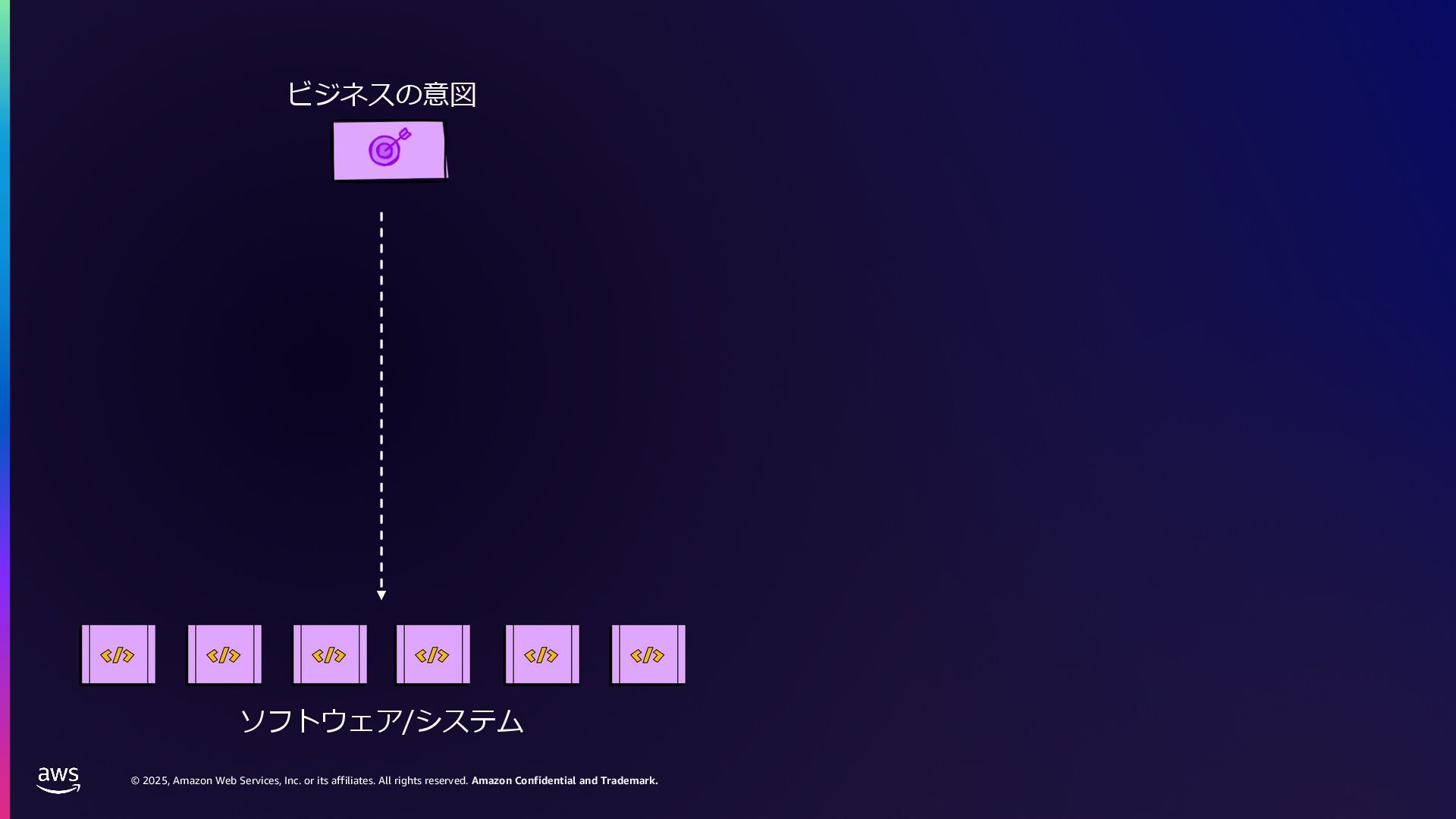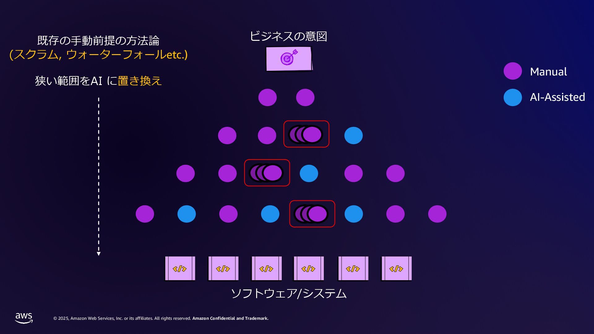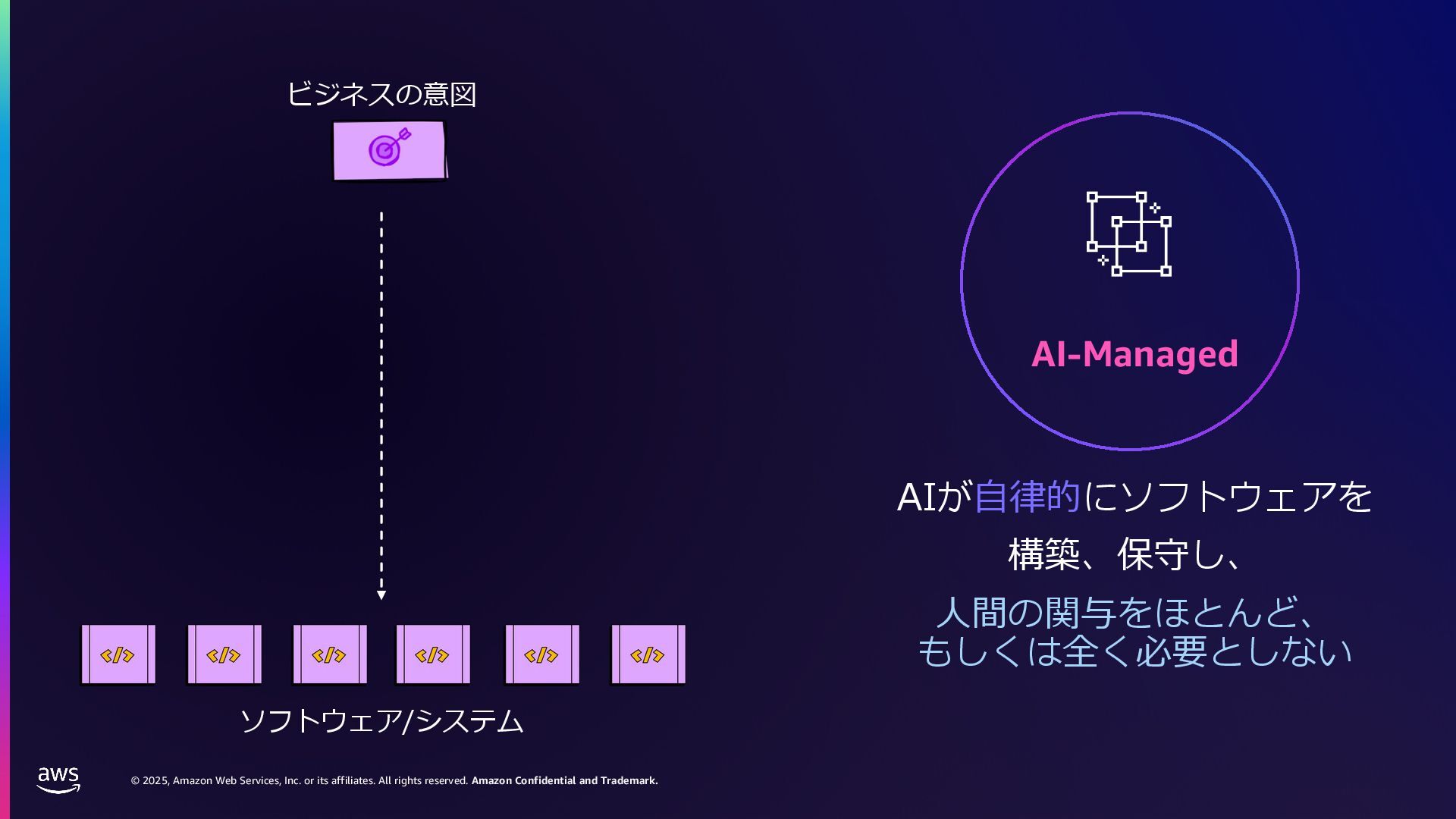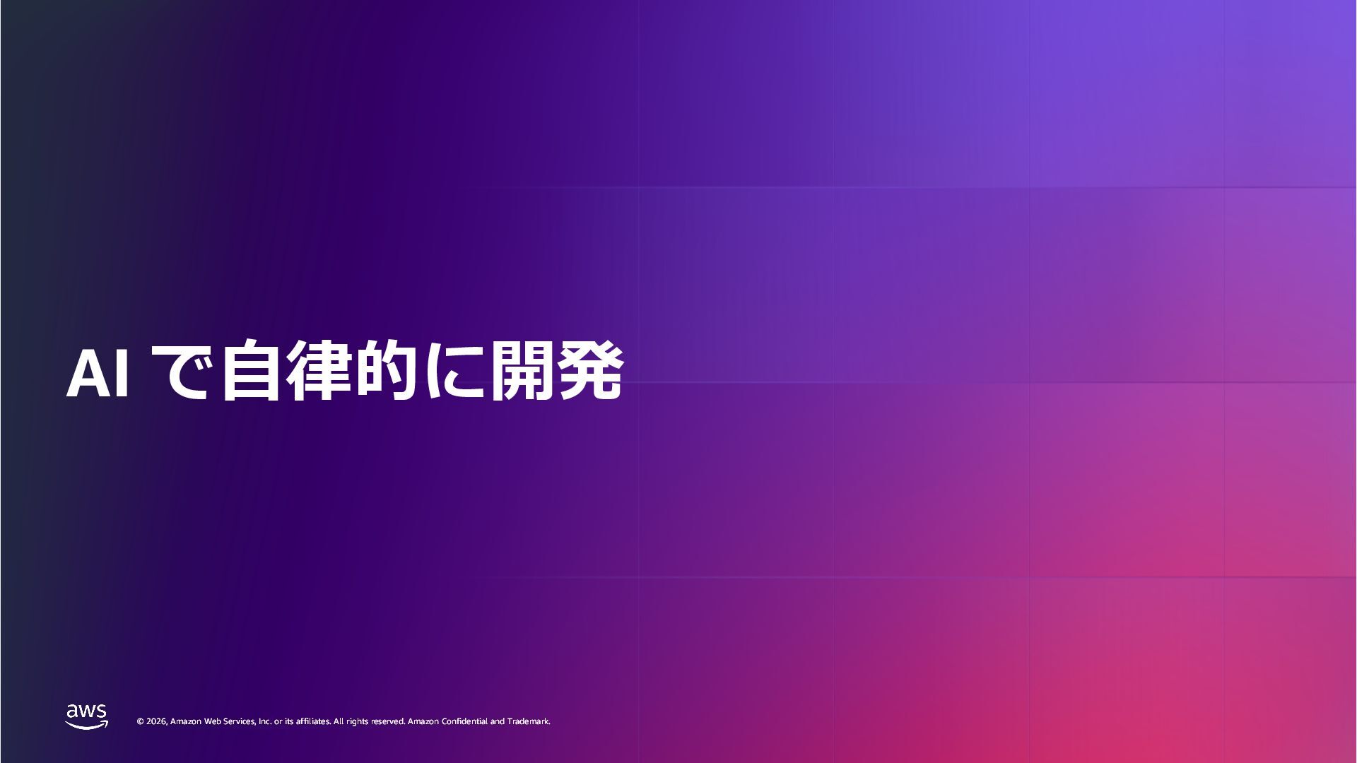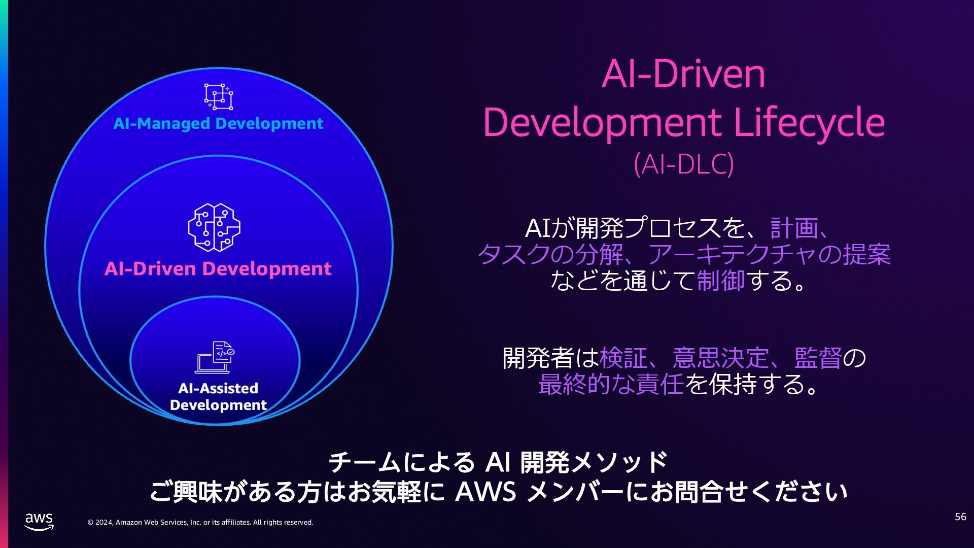 rights reserved. Amazon Confidential and Trademark. AI-DLC: ダイナミックなチームコラボレーション AI がルーティンタスクを処理する⼀⽅で、チームはリアルタイムでの問題解決、創造的思考、 迅速な意思決定のために、コラボレーションしやすい環境で協⼒します。この孤⽴した作業から 活気のあるチーム作業への転換は、イノベーションと成果物の提供を加速します。 - AI 駆動開発ライフサイクル:ソフトウェアエンジニアリングの再構築 Biz Dev これまで 要件/PBI スプリント/ 開発 ソフトウェア レビュー/ テスト :⼈間の作業待ち時間 要件/PBI ソフトウェア AI-DLC Biz Dev 問題解決/創造的な意思決定 AIが全て作成-> ⼈間の作業待ち時間なし