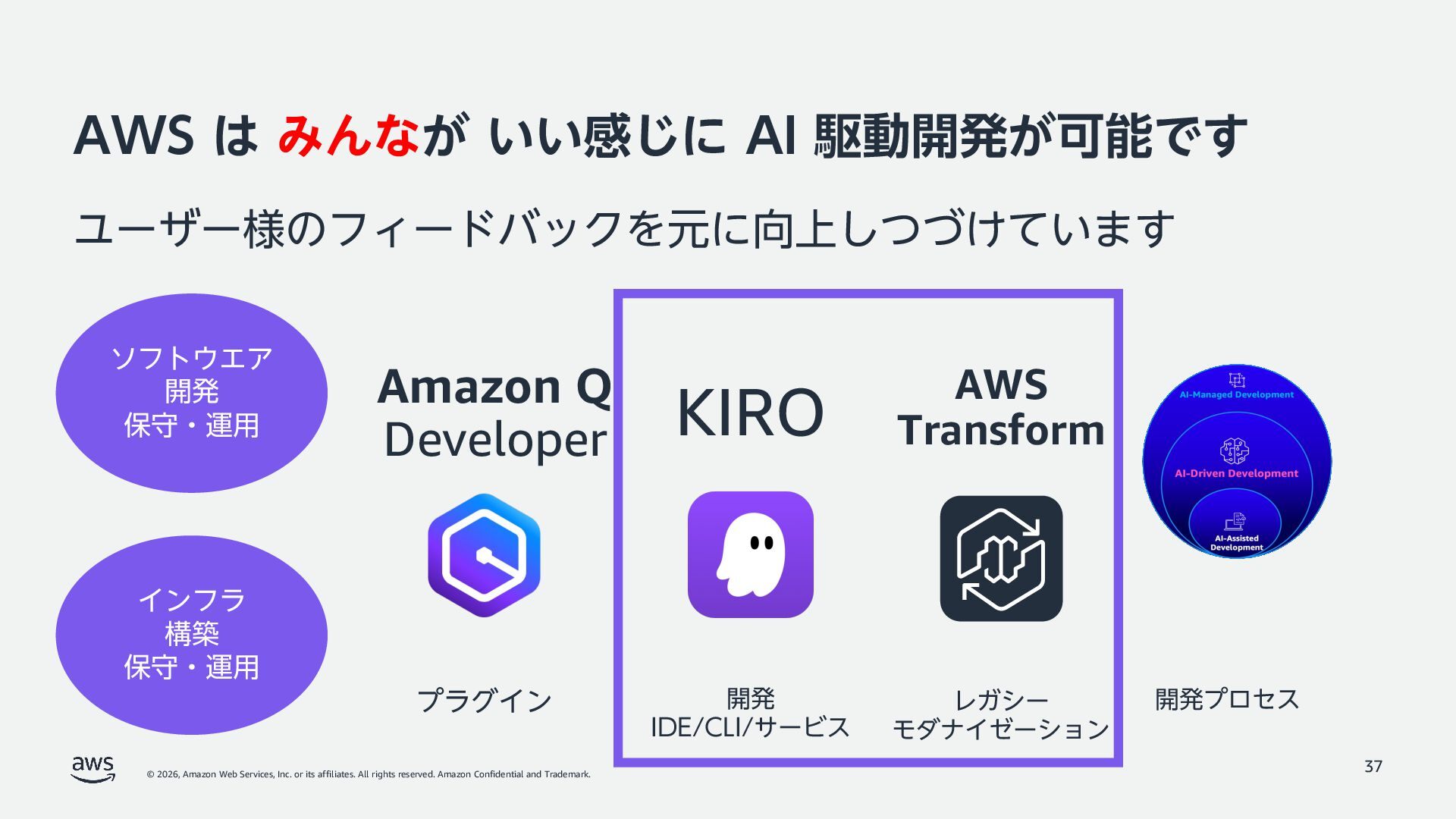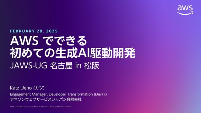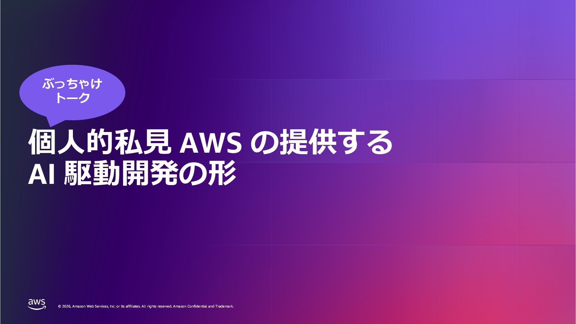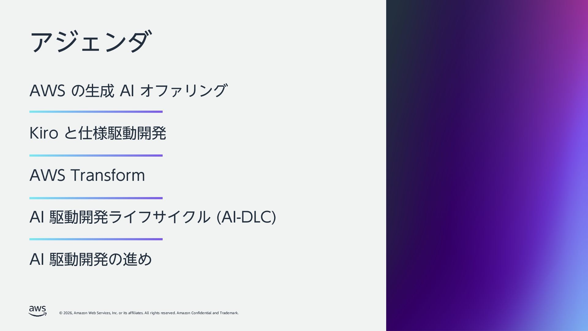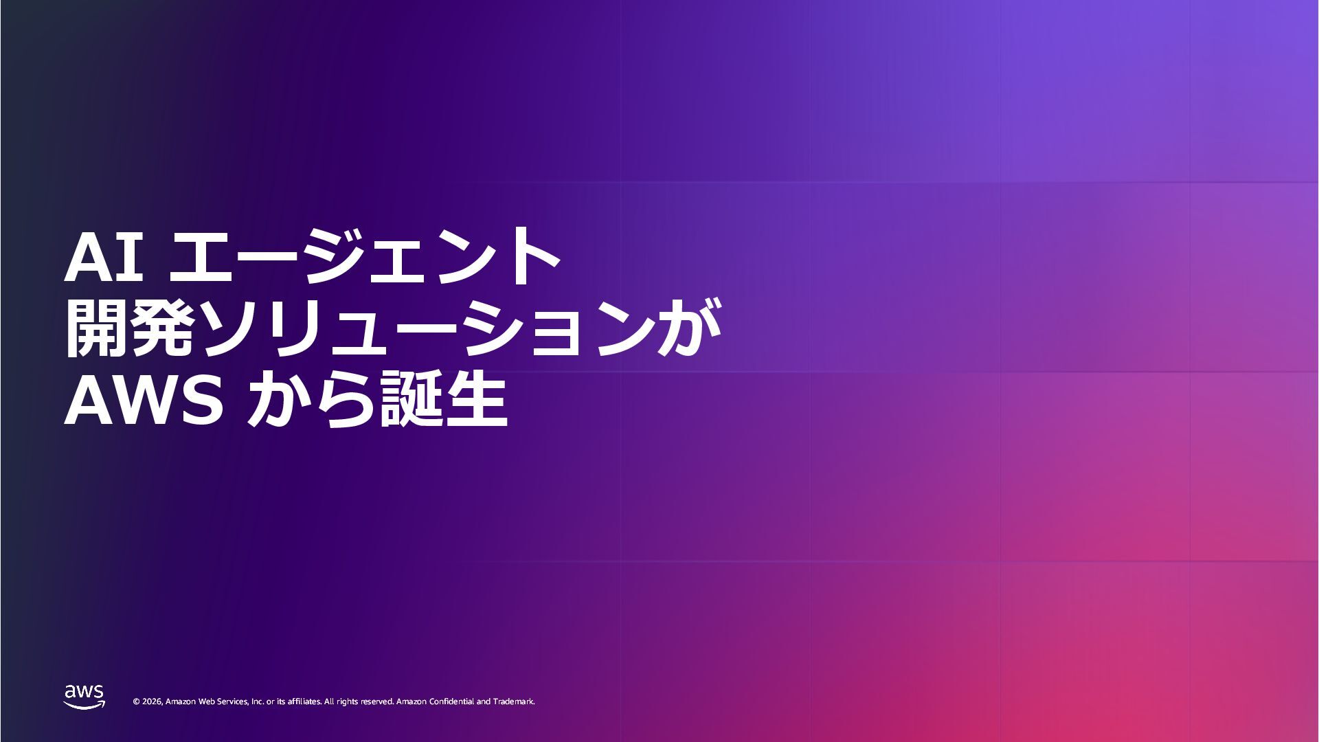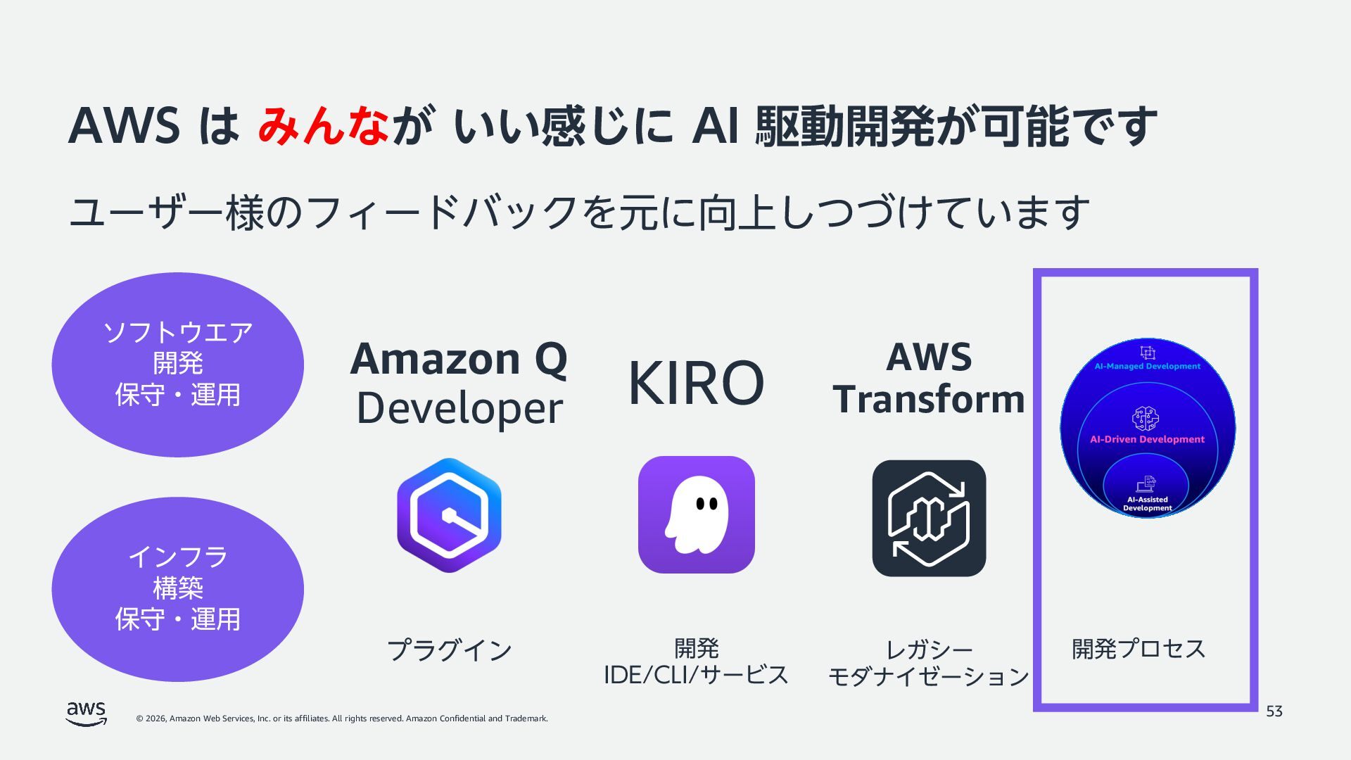 rights reserved. Amazon Confidential and Trademark. AI-DLC: ダイナミックなチームコラボレーション AI がルーティンタスクを処理する⼀⽅で、チームはリアルタイムでの問題解決、創造的思考、 迅速な意思決定のために、コラボレーションしやすい環境で協⼒します。この孤⽴した作業から 活気のあるチーム作業への転換は、イノベーションと成果物の提供を加速します。 - AI 駆動開発ライフサイクル:ソフトウェアエンジニアリングの再構築 Biz Dev これまで 要件/PBI スプリント/ 開発 ソフトウェア レビュー/ テスト :⼈間の作業待ち時間 要件/PBI ソフトウェア AI-DLC Biz Dev 問題解決/創造的な意思決定 AIが全て作成-> ⼈間の作業待ち時間なし