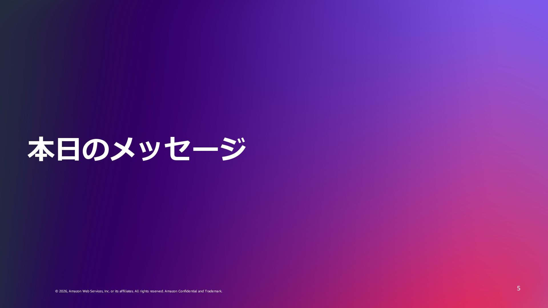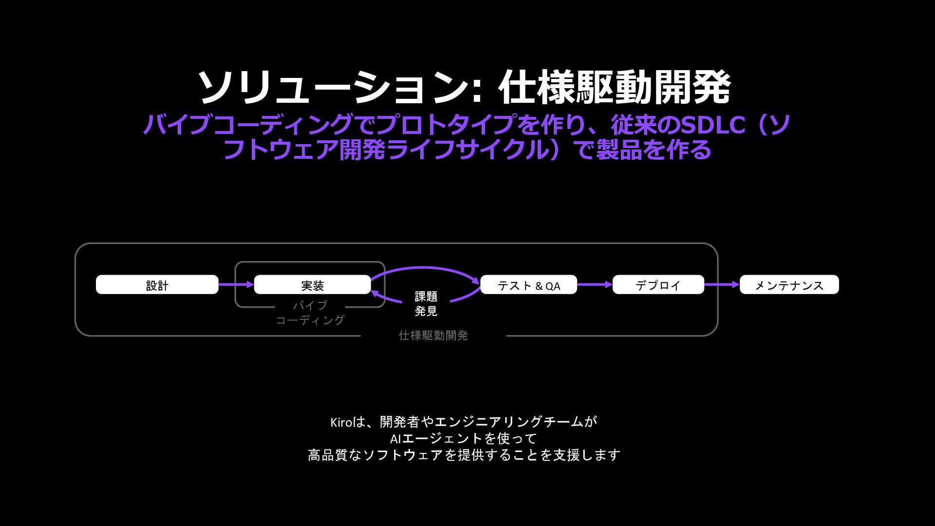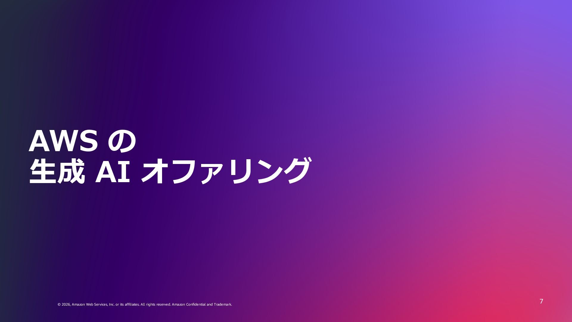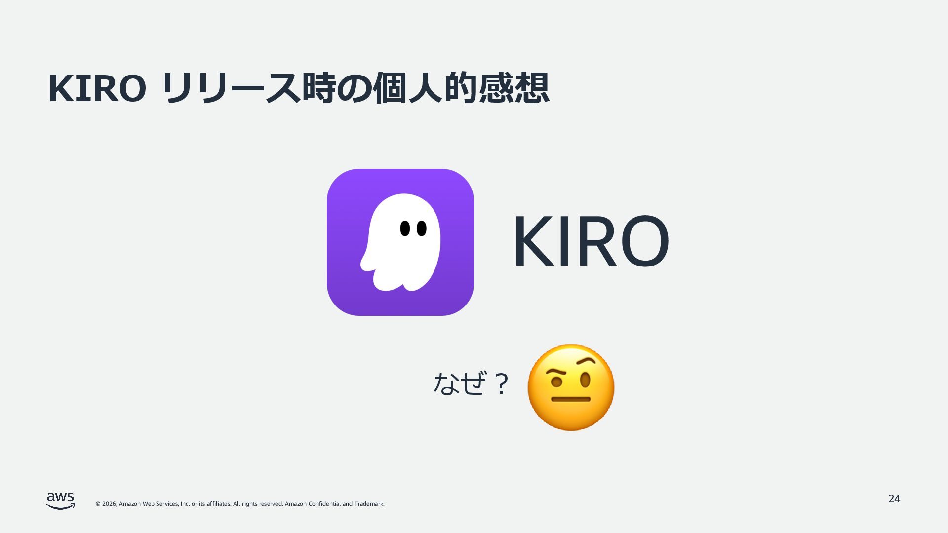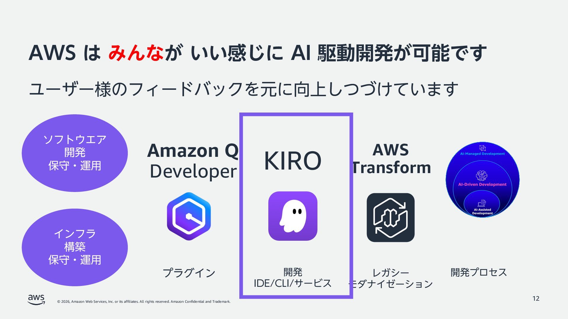 rights reserved. Amazon Confidential and Trademark. AI-DLC: ダイナミックなチームコラボレーション AI がルーティンタスクを処理する⼀⽅で、チームはリアルタイムでの問題解決、創造的思考、 迅速な意思決定のために、コラボレーションしやすい環境で協⼒します。この孤⽴した作業から 活気のあるチーム作業への転換は、イノベーションと成果物の提供を加速します。 - AI 駆動開発ライフサイクル:ソフトウェアエンジニアリングの再構築 Biz Dev これまで 要件/PBI スプリント/ 開発 ソフトウェア レビュー/ テスト :⼈間の作業待ち時間 要件/PBI ソフトウェア AI-DLC Biz Dev 問題解決/創造的な意思決定 AIが全て作成-> ⼈間の作業待ち時間なし