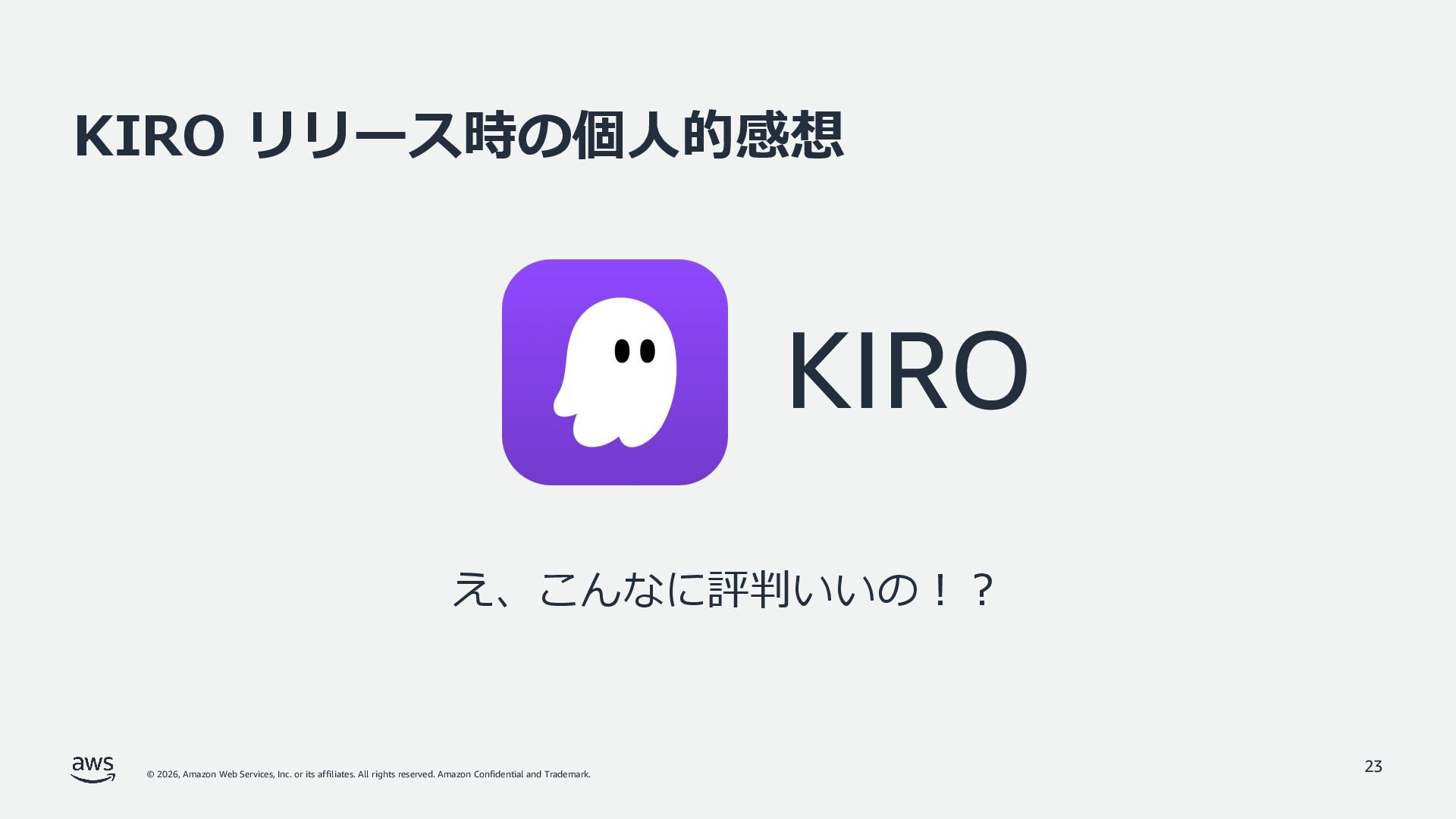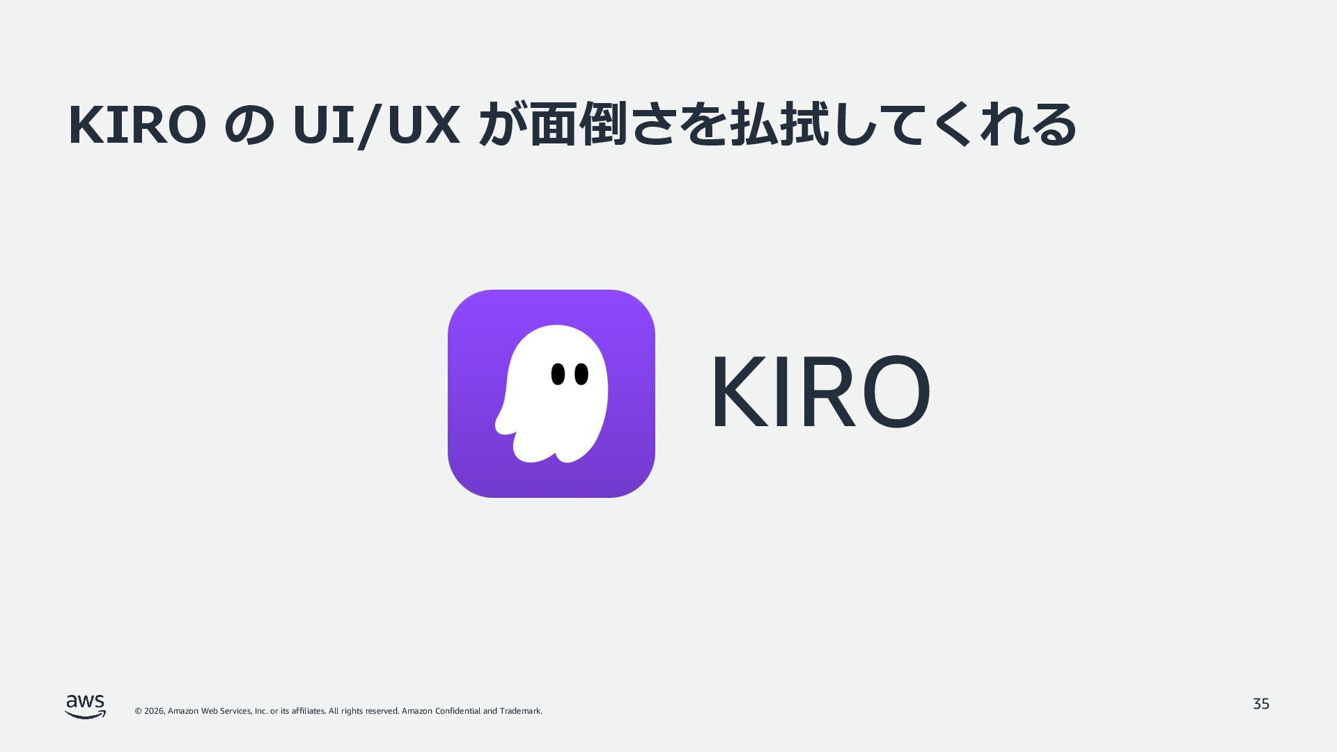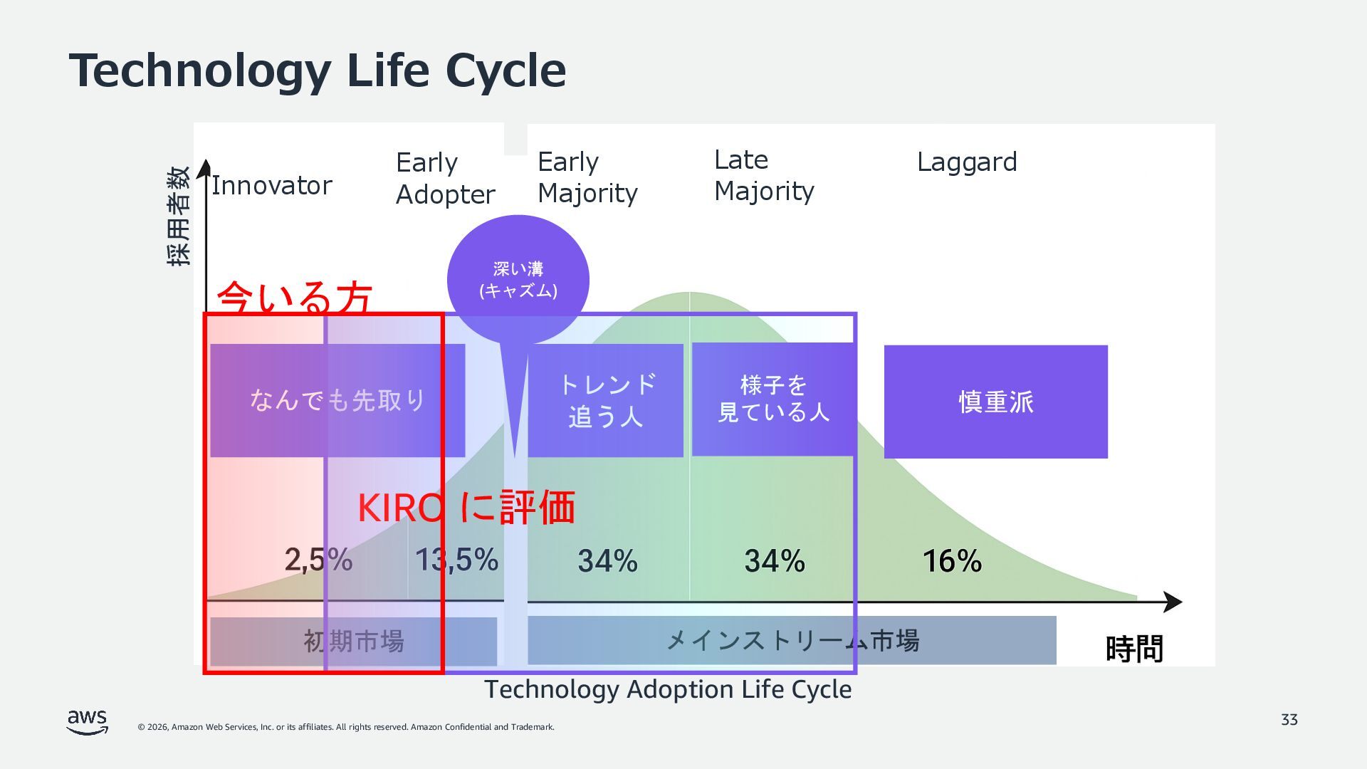 rights reserved. Amazon Confidential and Trademark. 34 Technology Life Cycle なんでも先取り トレンド 追う人 様子を 見ている人 慎重派 Innovator Early Adopter Early Majority Late Majority Laggard 深い溝 (キャズム) 初期市場 メインストリーム市場 採用者数 Technology Adoption Life Cycle KIRO に評価