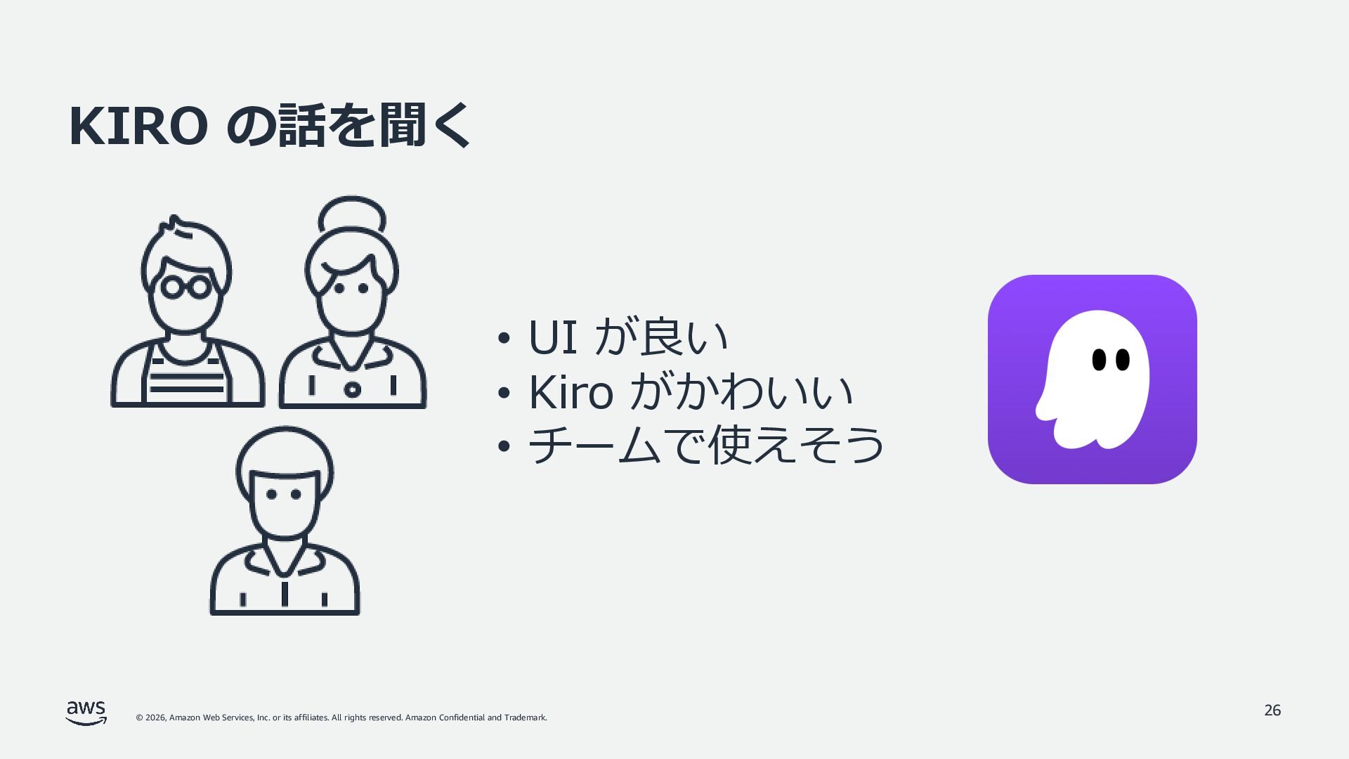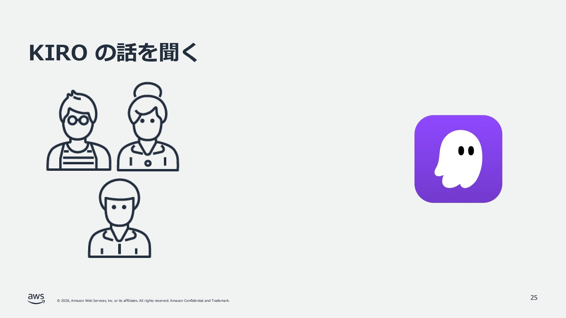 rights reserved. Amazon Confidential and Trademark. AI Creates Plan Humans Verify the Plan AI Refines the Plan AI Executes the Plan Humans Verify the Outcome AI-DLC の基本的な作業の進め⽅ “プラン→レビュー→実⾏→レビュー“ 1. AIにプランを作らせる 2. ⼈がプランをレビューする 3. AIがプランを修正する 4. AI がプランを実⾏する 5. ⼈が結果を確認する