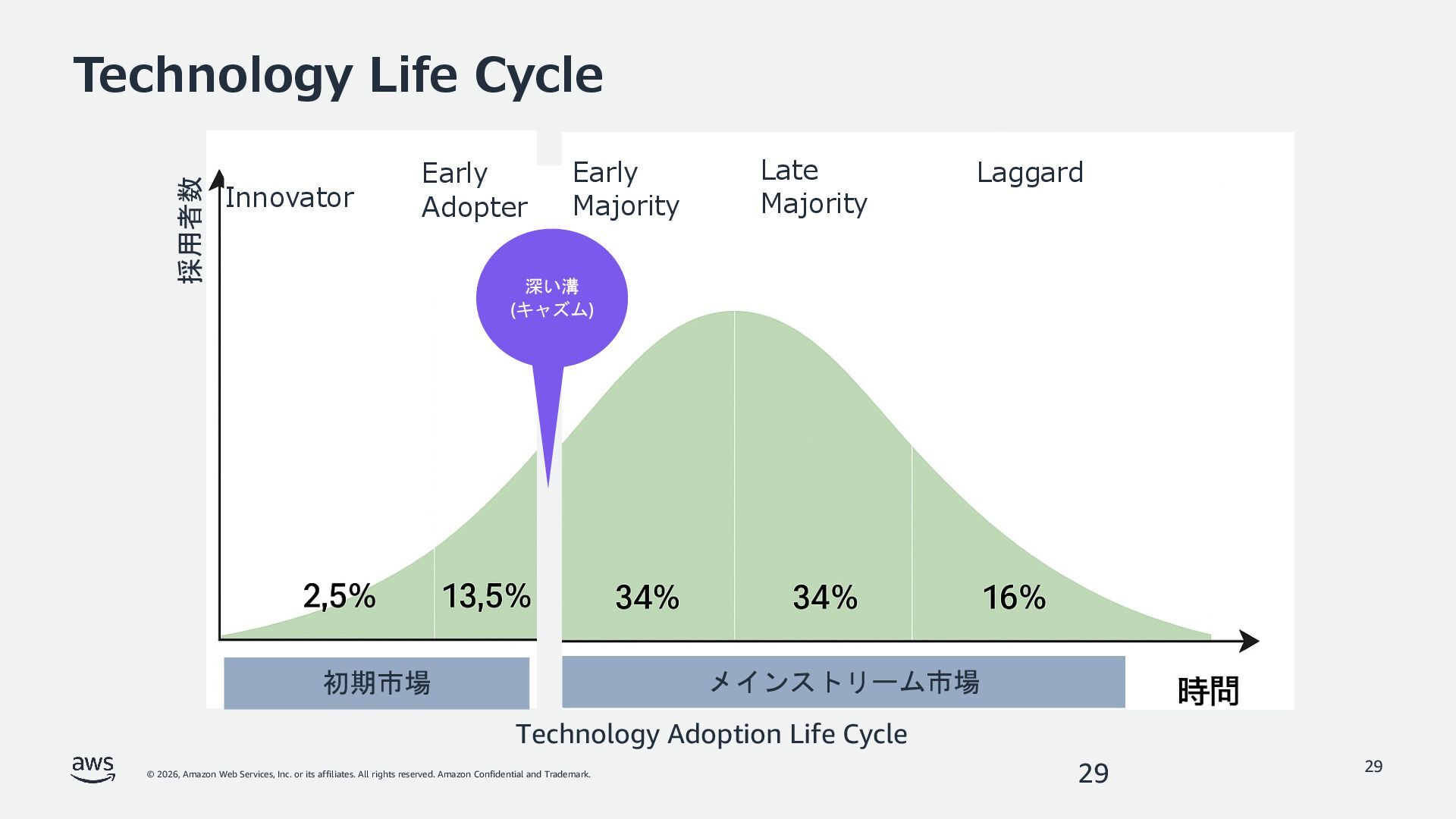 rights reserved. Amazon Confidential and Trademark. 33 Technology Life Cycle なんでも先取り トレンド 追う人 様子を 見ている人 慎重派 Innovator Early Adopter Early Majority Late Majority Laggard 深い溝 (キャズム) 初期市場 メインストリーム市場 採用者数 Technology Adoption Life Cycle 今いる方