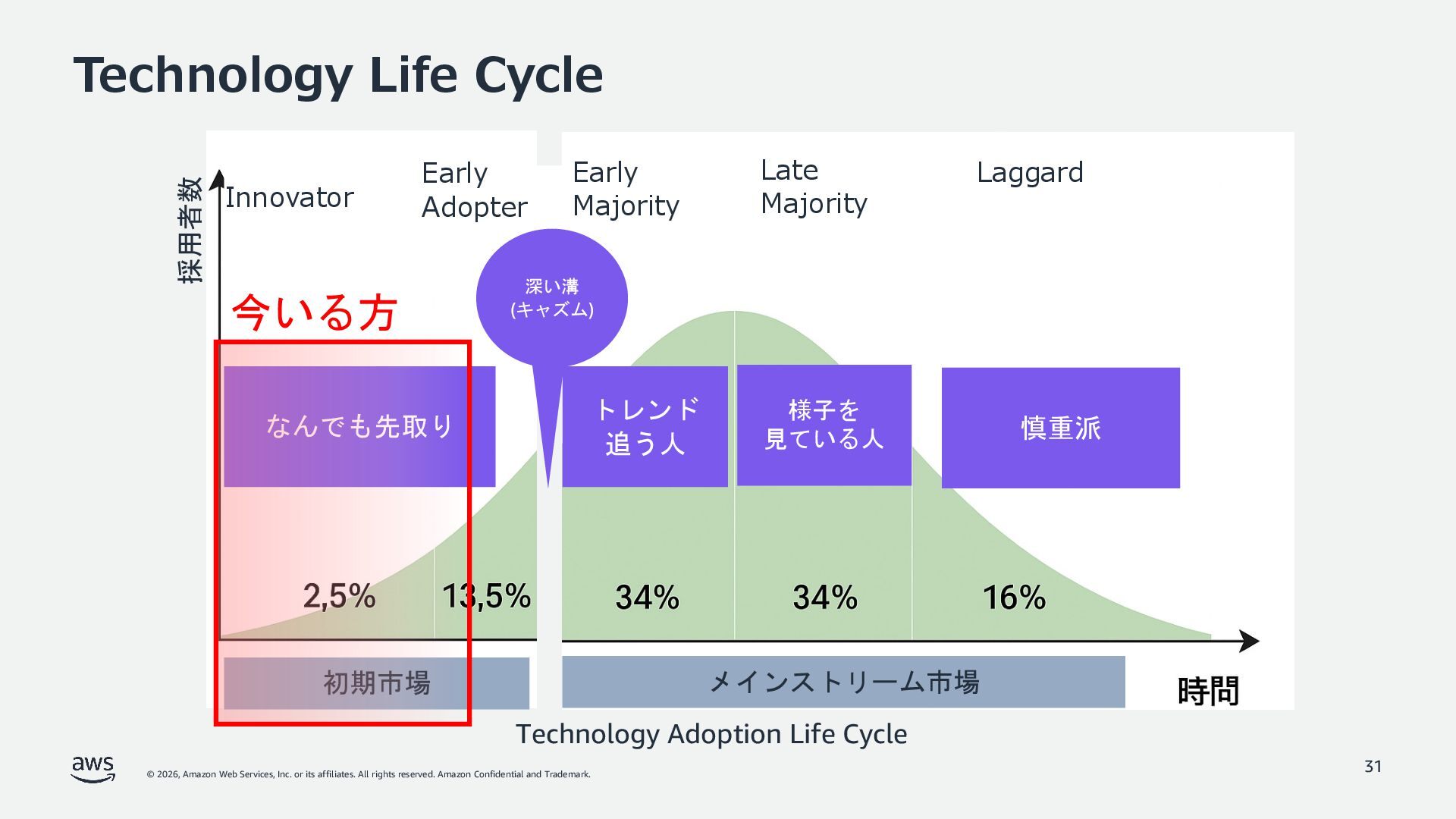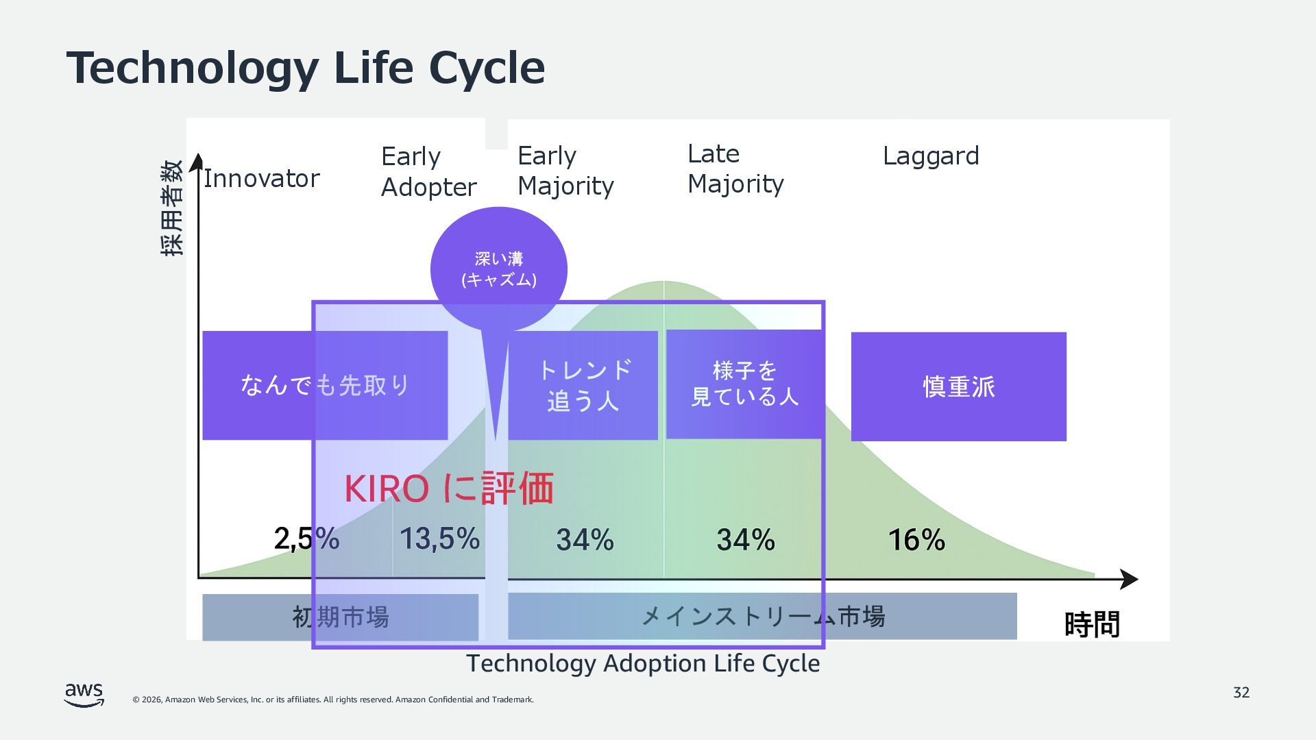 rights reserved. Amazon Confidential and Trademark. 31 Technology Life Cycle 31 Innovator Early Adopter Early Majority Late Majority Laggard 深い溝 (キャズム) 初期市場 メインストリーム市場 採用者数 Technology Adoption Life Cycle