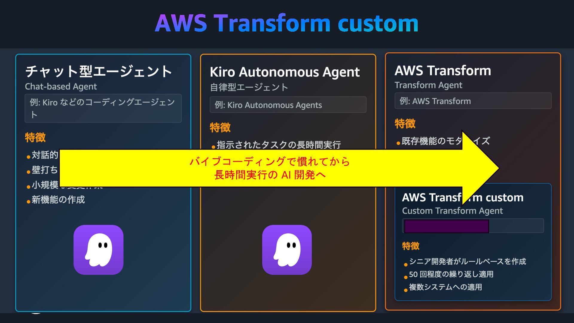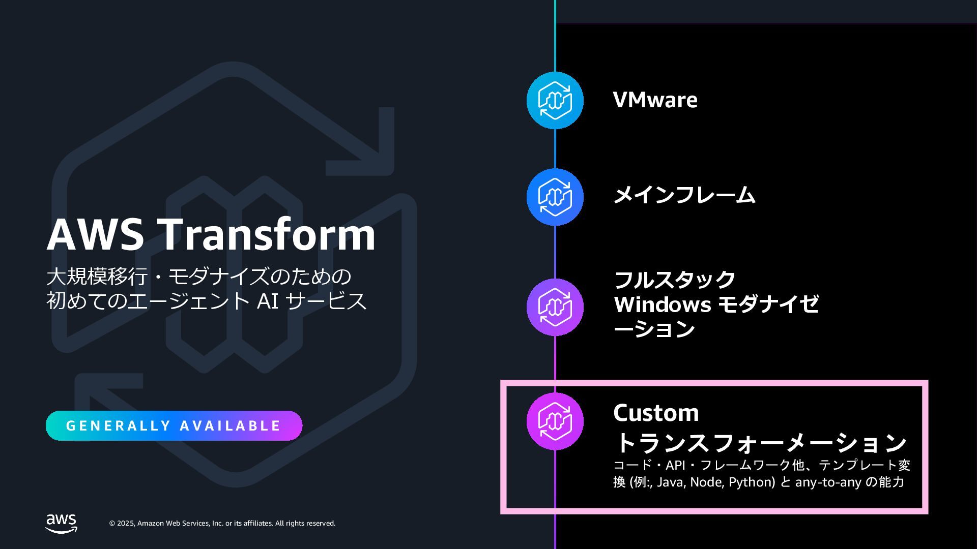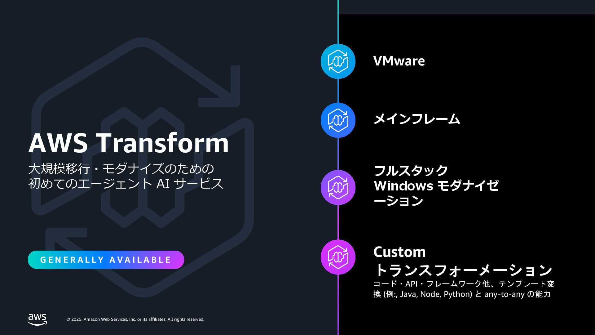 rights reserved. AWS Transform ⼤規模移⾏・モダナイズのための 初めてのエージェント AI サービス G E N E R A L L Y A V A I L A B L E VMware メインフレーム フルスタック Windows モダナイゼ ーション Custom トランスフォーメーション コード・API・フレームワーク他、テンプレート変 換 (例:, Java, Node, Python) と any-to-any の能力