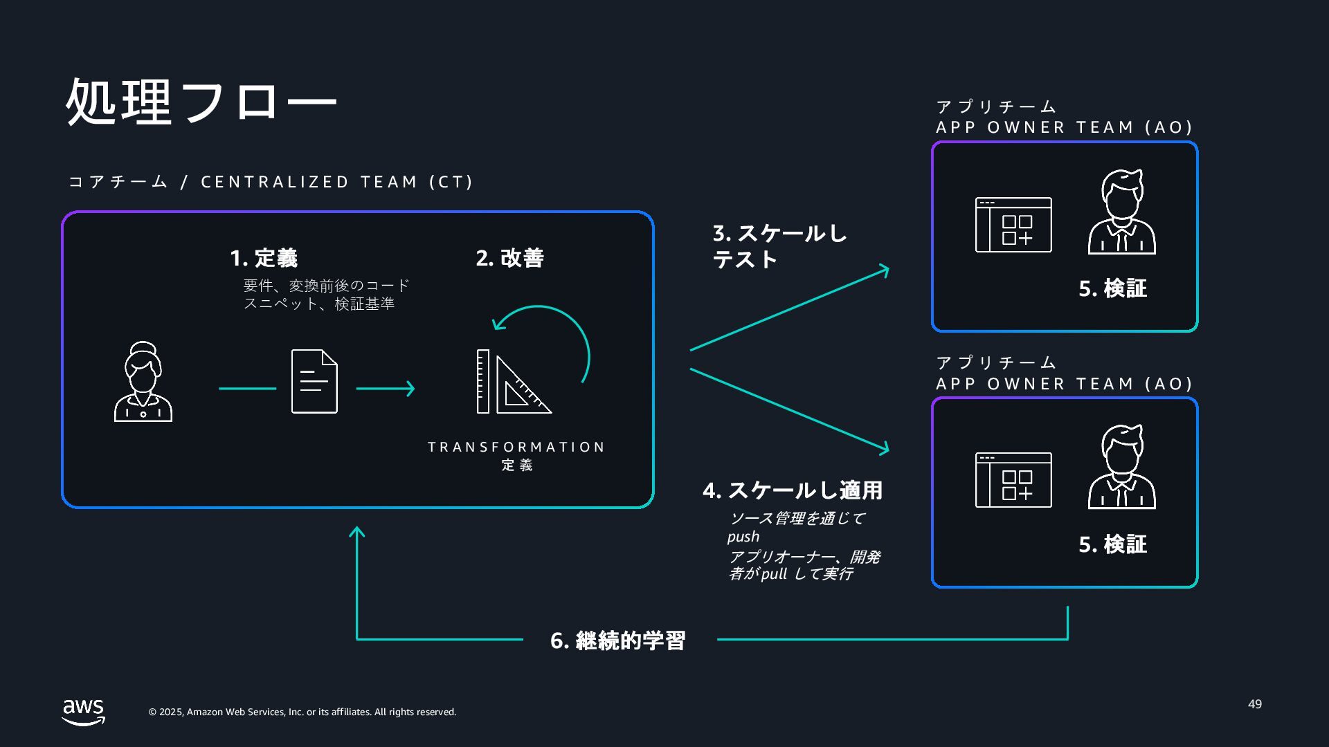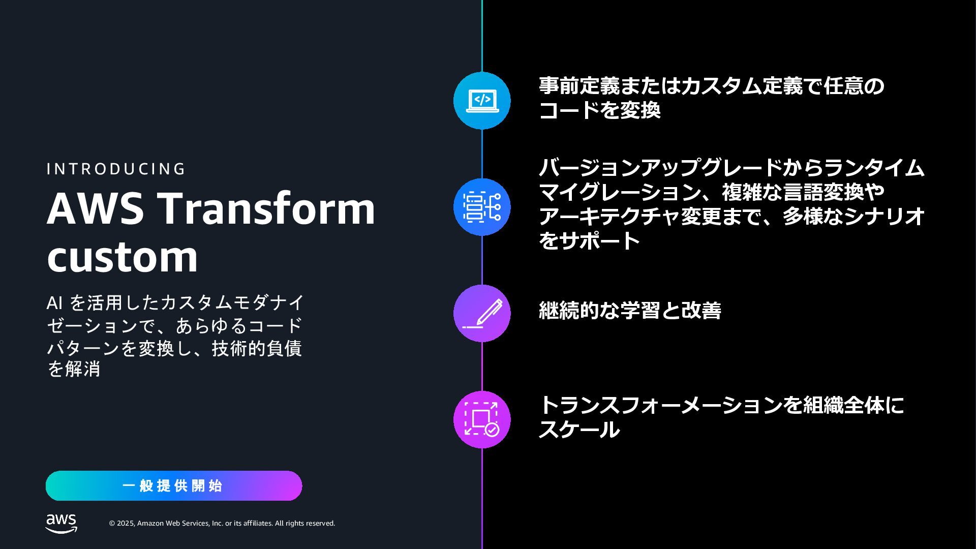 rights reserved. I N T R O D U C I N G AWS Transform custom AI を活用したカスタムモダナイ ゼーションで、あらゆるコード パターンを変換し、技術的負債 を解消 事前定義またはカスタム定義で任意の コードを変換 バージョンアップグレードからランタイム マイグレーション、複雑な⾔語変換や アーキテクチャ変更まで、多様なシナリオ をサポート 継続的な学習と改善 トランスフォーメーションを組織全体に スケール 一 般 提 供 開 始