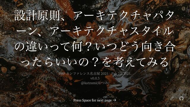 驚き最小の原 則 → 設計の原則 〇〇パターン MVC, ActiveRecord, Value Object, Server Session State, Domain Model, CQRS → アーキテクチャパターン 〇〇アーキテクチャ Layered, Clean, Hexagonal, Event Driven, Pipeline, Service Oriented → アーキテクチャスタイル 1. UNIX 哲学 "Basics of the Unix Philosophy" の基本原則の一つ ↩︎ 数多の用語がどういうカテゴリになるのか? [1]
