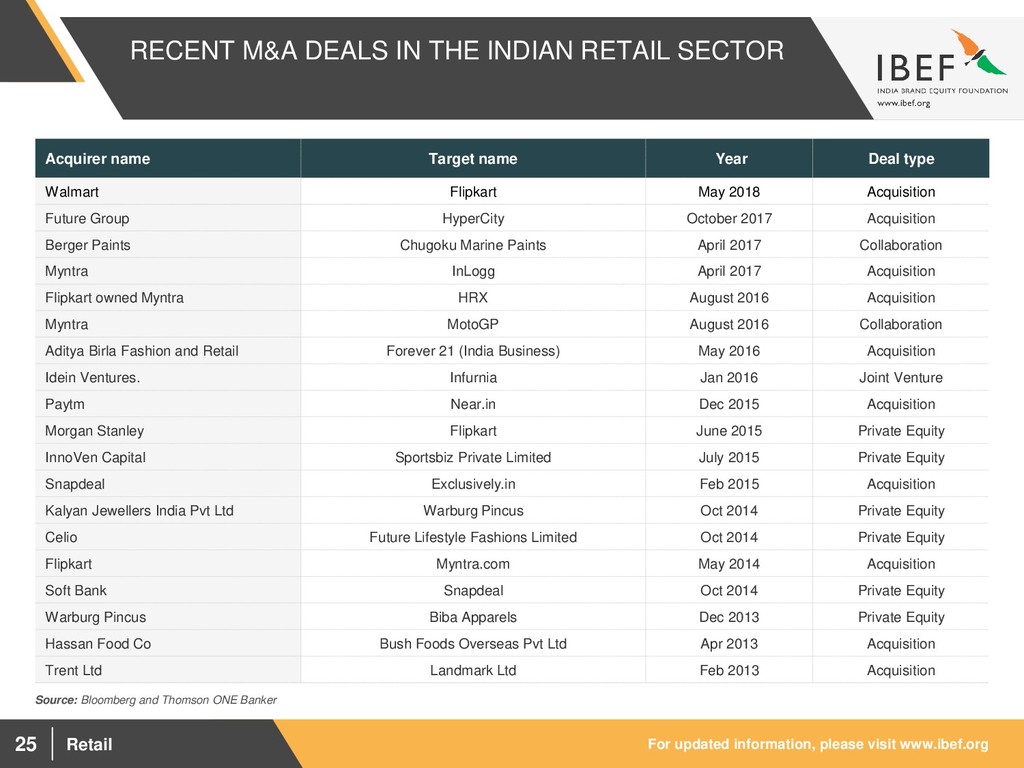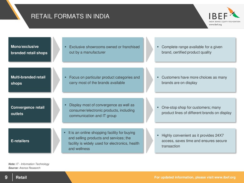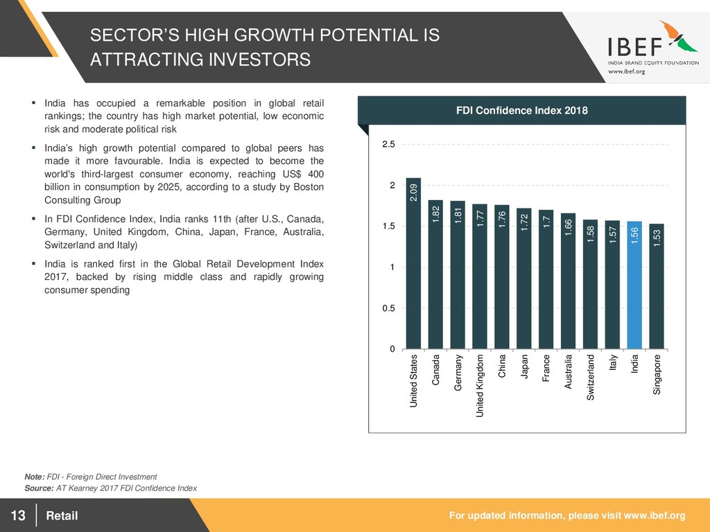 1,674.40 1,854.99 2,039.36 2,611.01 2,848.23 - 500.00 1,000.00 1,500.00 2,000.00 2,500.00 3,000.00 FY12 FY13 FY14 FY15 FY16 FY17 FY18 945.9 1,058.0 1,179.3 1,288.6 1,403.0 1,982.7 2,134.8 - 200.0 400.0 600.0 800.0 1,000.0 1,200.0 1,400.0 1,600.0 1,800.0 2,000.0 2,200.0 2,400.0 FY12 FY13 FY14 FY15 FY16 FY17 FY18 INCOME GROWTH TO DRIVE DEMAND FOR ORGANISED RETAIL Source: IMF Visakhapatnam port traffic (million tonnes) GDP at current prices (US$ billion) Visakhapatnam port traffic (million tonnes) GDP per capita at current prices (US$) Multiple drivers are leading to strong growth in Indian retail through a consumption boom Significant growth in discretionary income and changing lifestyles are among the major growth drivers of Indian retail Easy availability of credit and use of ‘plastic money’ have contributed to a strong and growing consumer culture in India Acceptance and usage of e-retailers by consumers are increasing due to convenience and secured financial transactions Expansion in the size of the upper middle class and advertisement has led to greater spending on luxury products and high brand consciousness In FY18, GDP at current prices was US$ 2,848.23 billion and GDP per capita at current prices was US$ 2,134.8