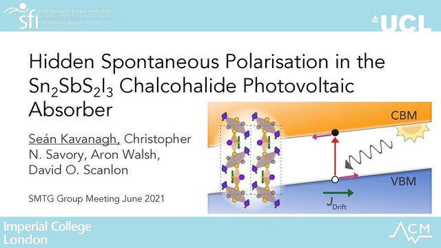 Slides for my SMTG Group Meeting talk on 'Hidden Spontaneous Polarisation in the ns2-Cation Sn2SbS2I3 Chalcohalide Photovoltaic Absorber' in June 2021.