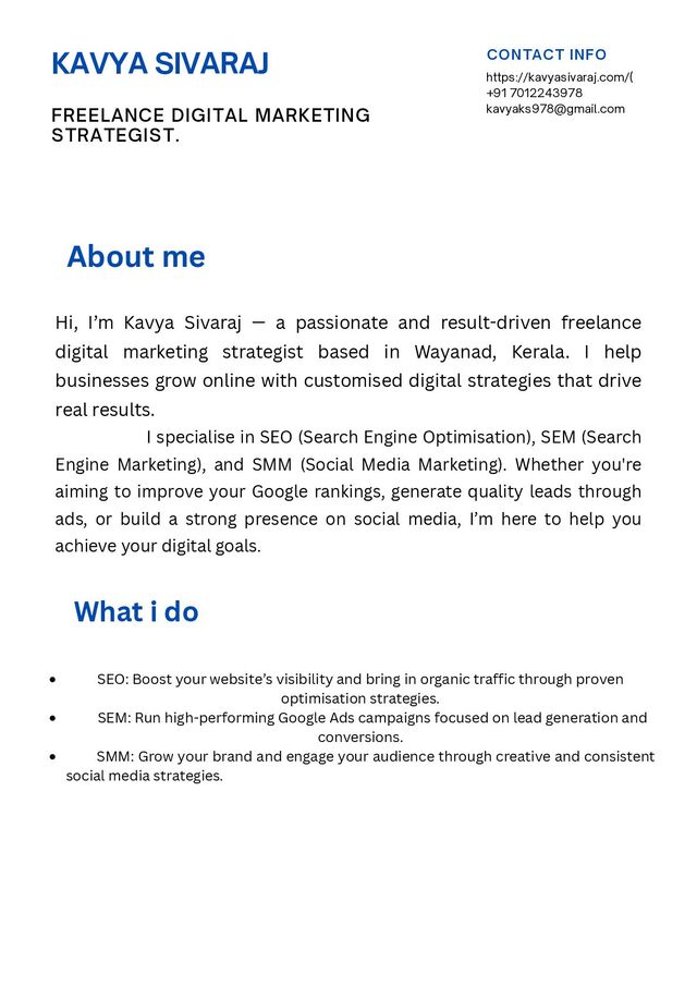 MARKETING STRATEGIST. About me Hi, I’m Kavya Sivaraj — a passionate and result-driven freelance digital marketing strategist based in Wayanad, Kerala. I help businesses grow online with customised digital strategies that drive real results. I specialise in SEO (Search Engine Optimisation), SEM (Search Engine Marketing), and SMM (Social Media Marketing). Whether you're aiming to improve your Google rankings, generate quality leads through ads, or build a strong presence on social media, I’m here to help you achieve your digital goals. What i do SEO: Boost your website’s visibility and bring in organic traffic through proven optimisation strategies. SEM: Run high-performing Google Ads campaigns focused on lead generation and conversions. SMM: Grow your brand and engage your audience through creative and consistent social media strategies.