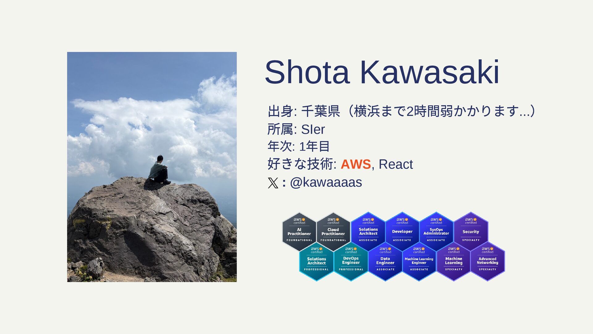 出身: 千葉県(横浜まで2 時間弱かかります... ) 所属: SIer 年次: 1 年目 好きな技術: