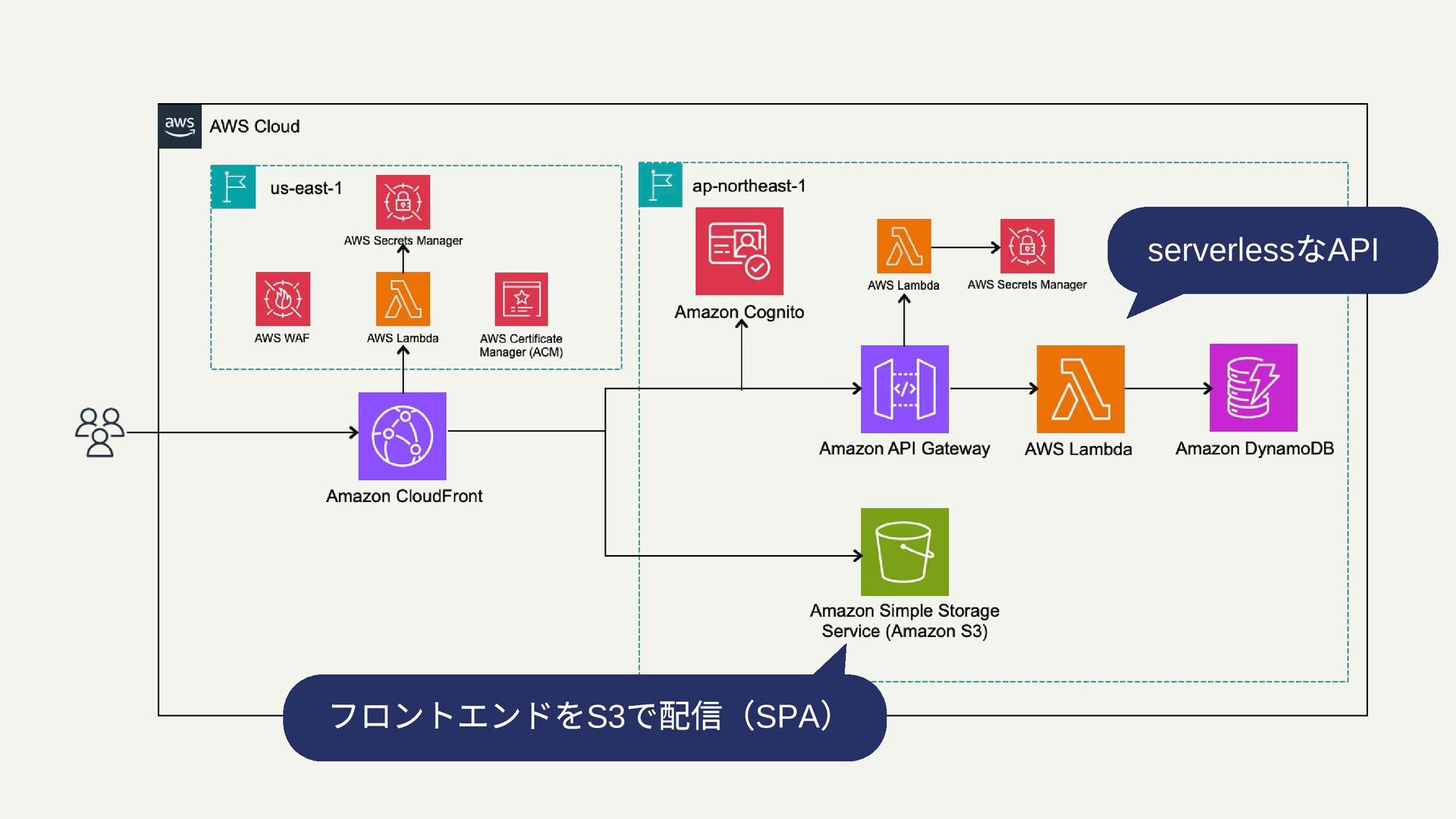 フロントエンドをS3 で配信(SPA ) serverless なAPI