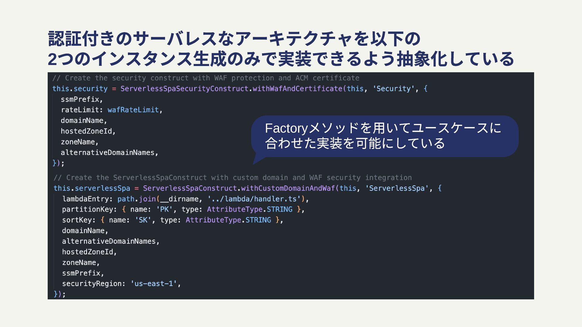 認証付きのサーバレスなアーキテクチャを以下の 2 つのインスタンス⽣成のみで実装できるよう抽象化している Factory メソッドを⽤いてユースケースに 合わせた実装を可能にしている