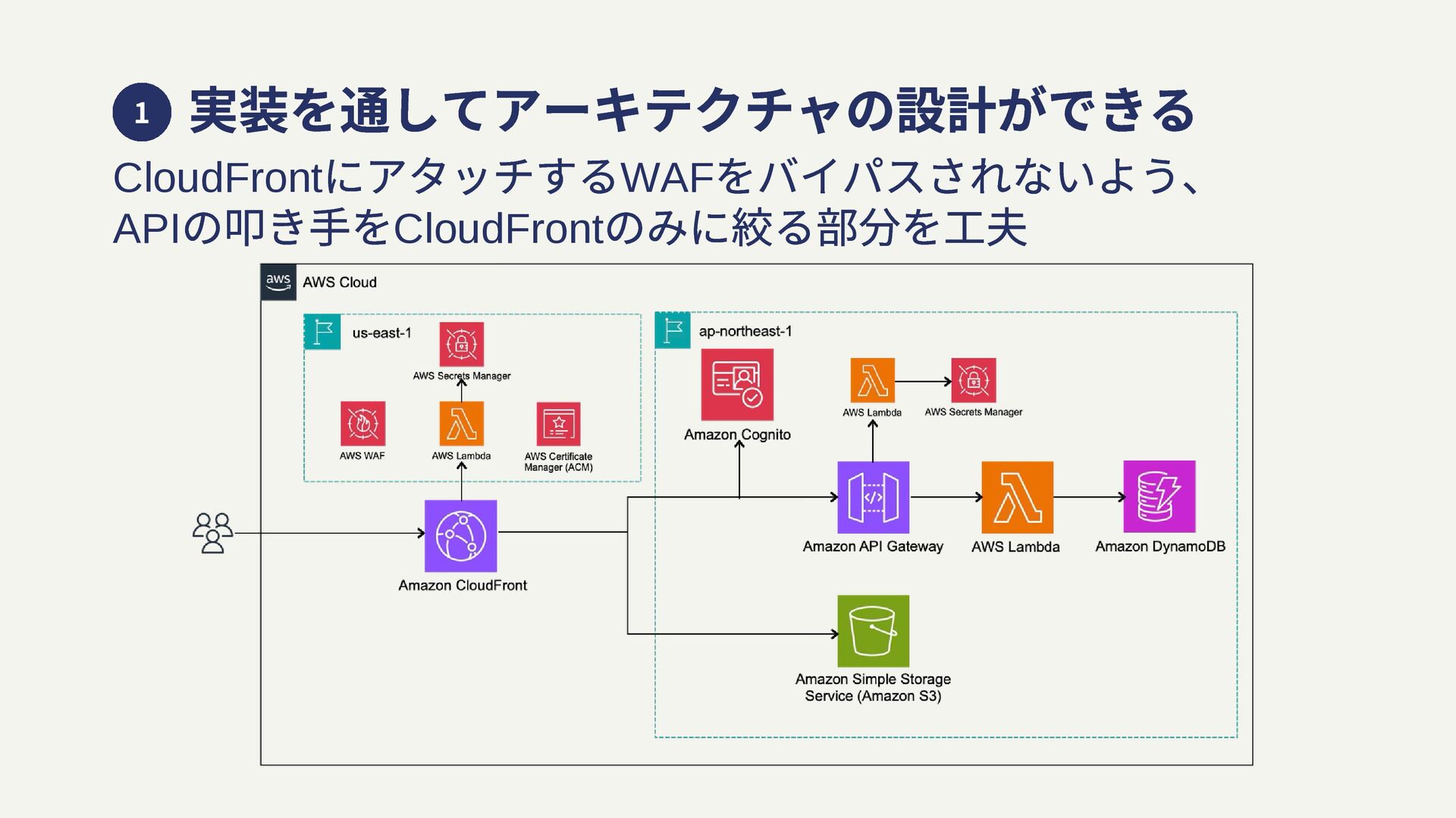 実装を通してアーキテクチャの設計ができる CloudFront にアタッチするWAF をバイパスされないよう、 API の叩き⼿をCloudFront のみに絞る部分を⼯夫 1