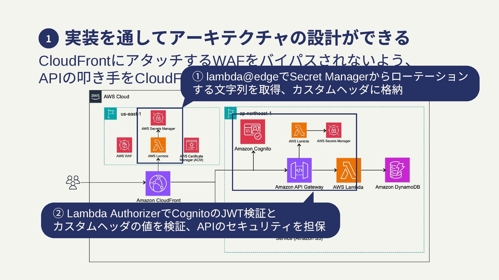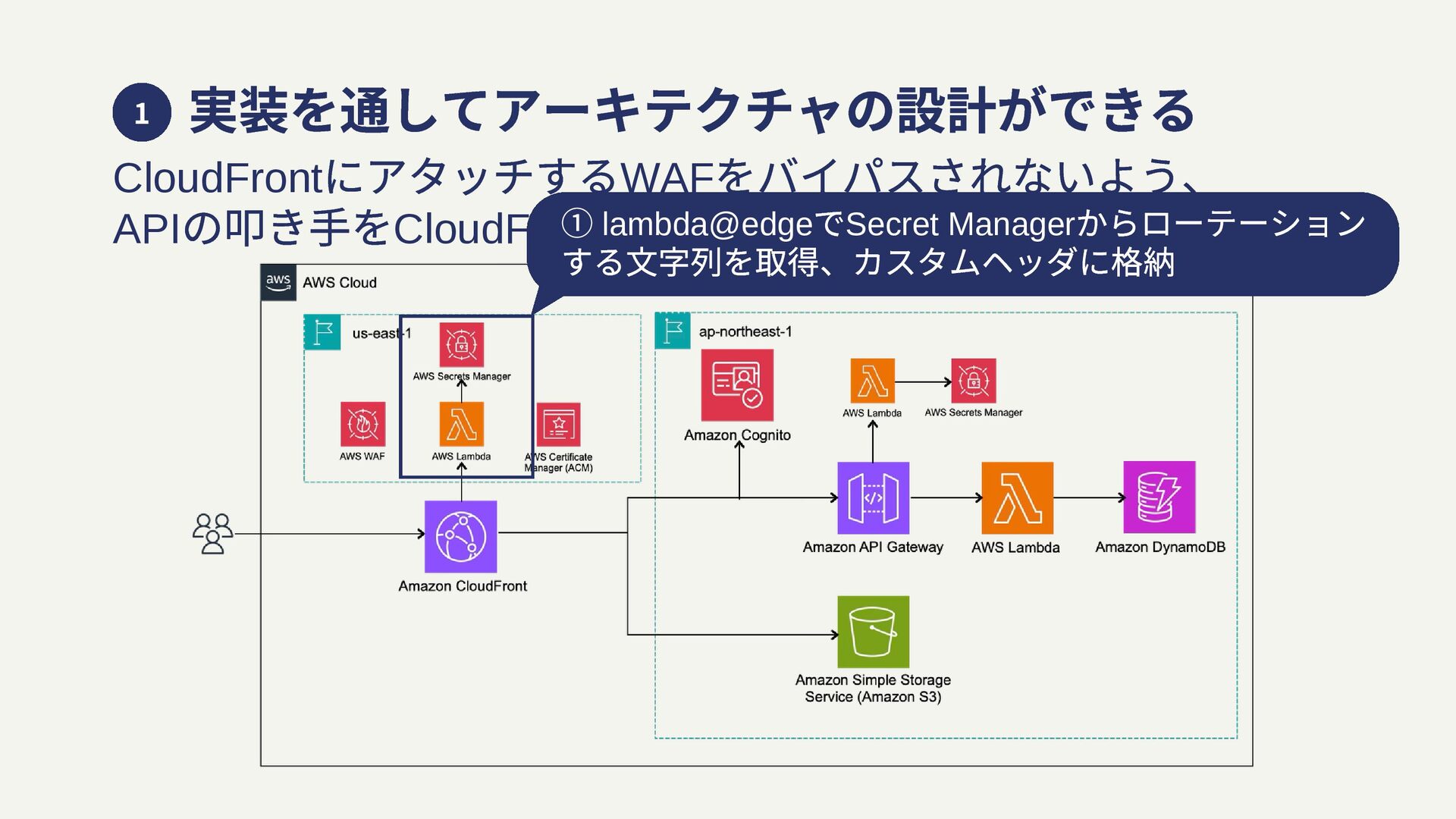実装を通してアーキテクチャの設計ができる CloudFront にアタッチするWAF をバイパスされないよう、 API の叩き⼿をCloudFront のみに絞る部分を⼯夫 1 ① lambda@edge