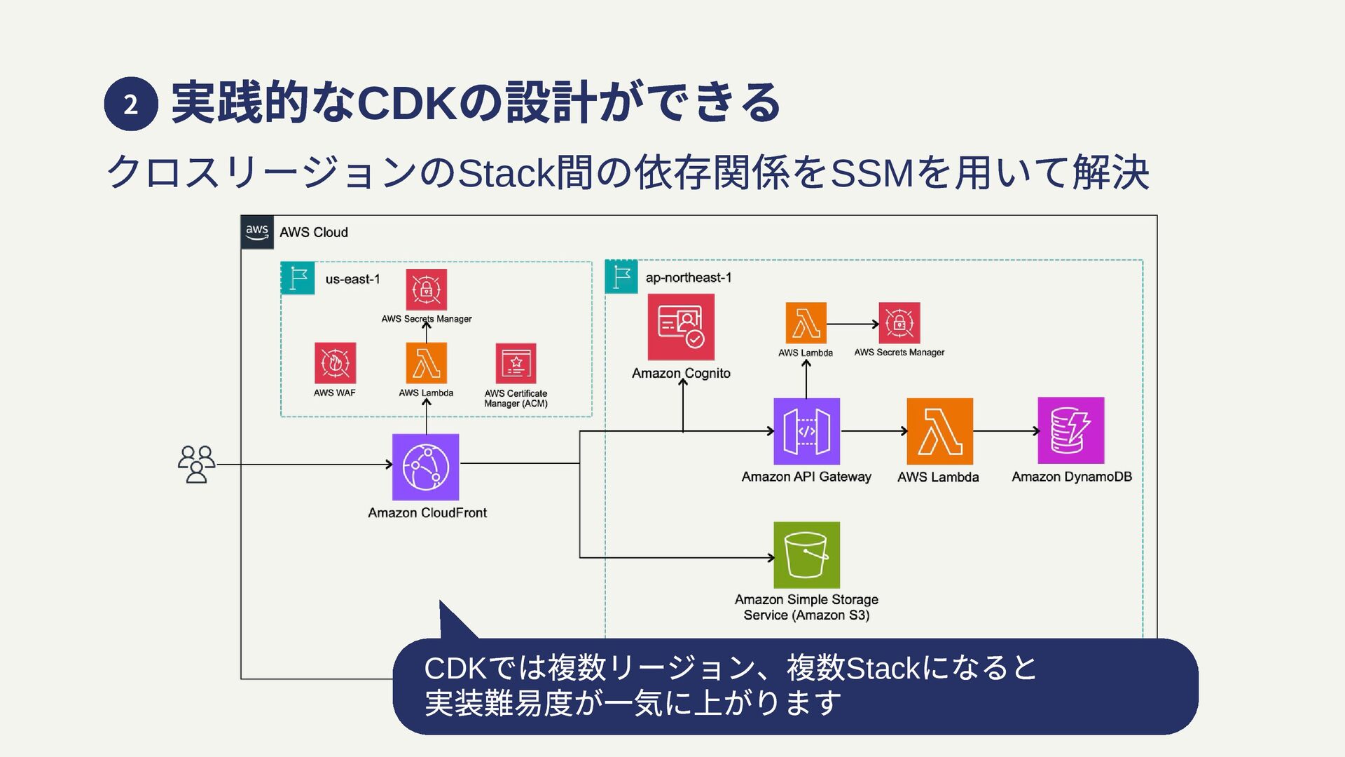 実践的なCDK の設計ができる クロスリージョンのStack 間の依存関係をSSM を⽤いて解決 CDK では複数リージョン、複数Stack になると 実装難易度が一気に上がります 2