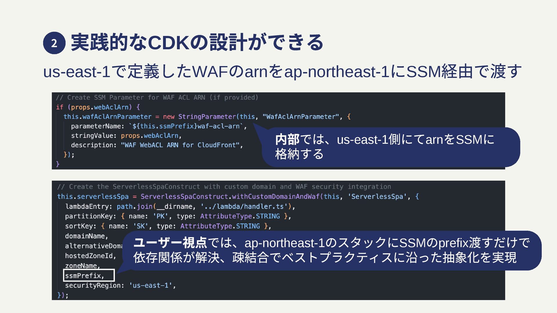 格納する ユーザー視点では、ap-northeast-1 のスタックにSSM のprefix 渡すだけで 依存関係が解決、疎結合でベストプラクティスに沿った抽象化を実現 実践的なCDK の設計ができる 2