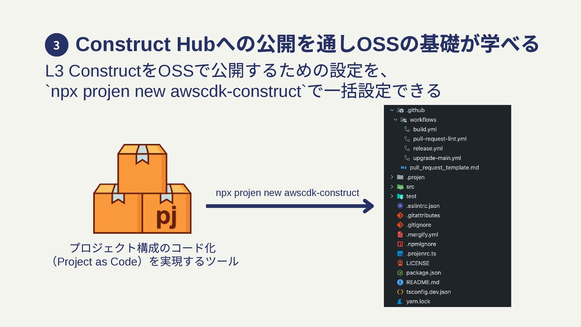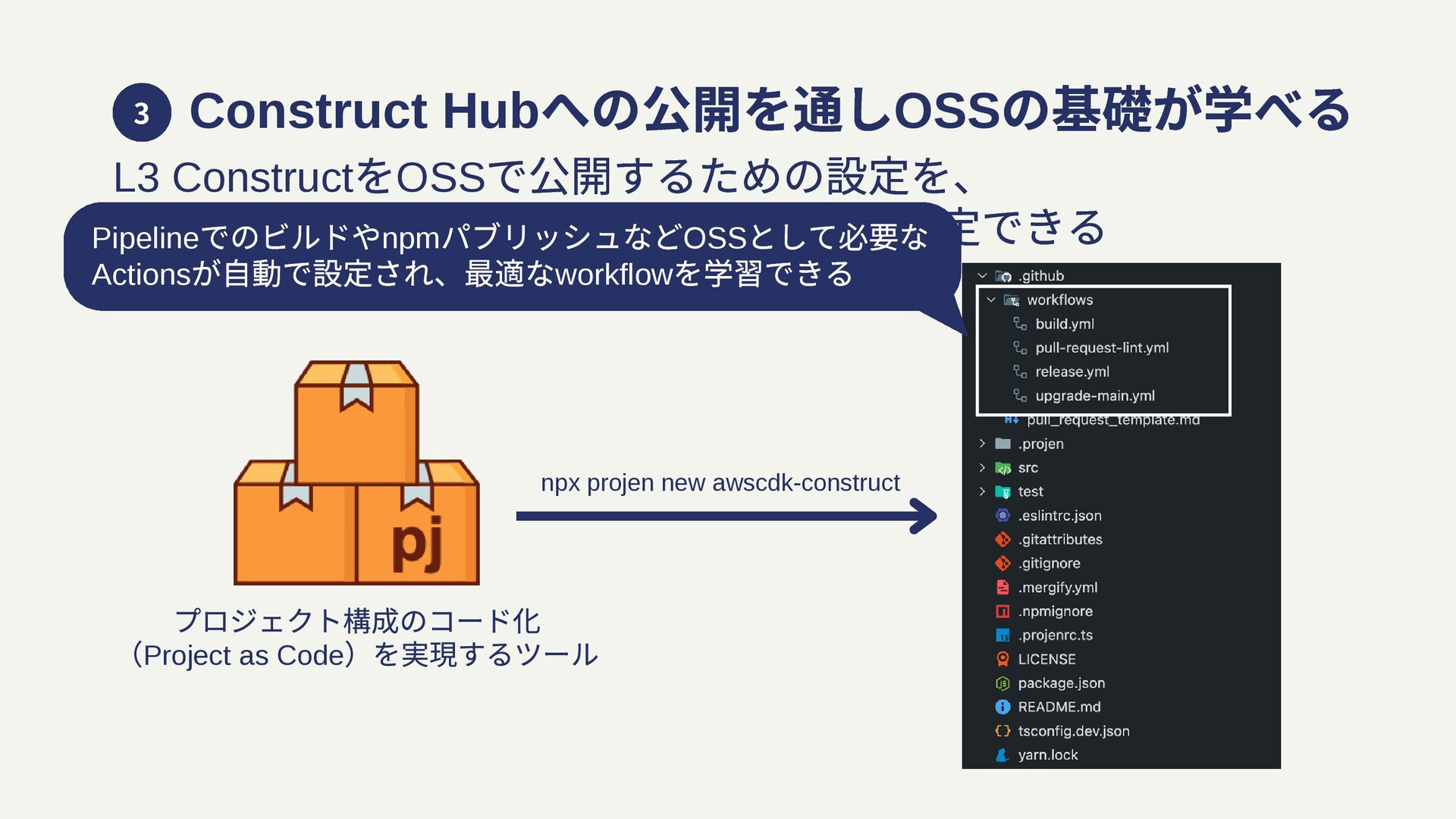 projen new awscdk-construct` で⼀括設定できる プロジェクト構成のコード化 (Project as Code )を実現するツール npx projen new awscdk-construct Pipeline でのビルドやnpm パブリッシュなどOSS として必要な Actions が自動で設定され、最適なworkflow を学習できる