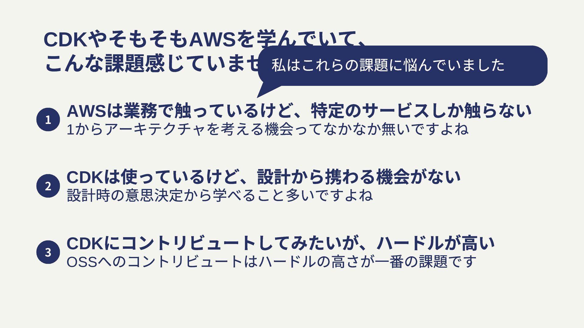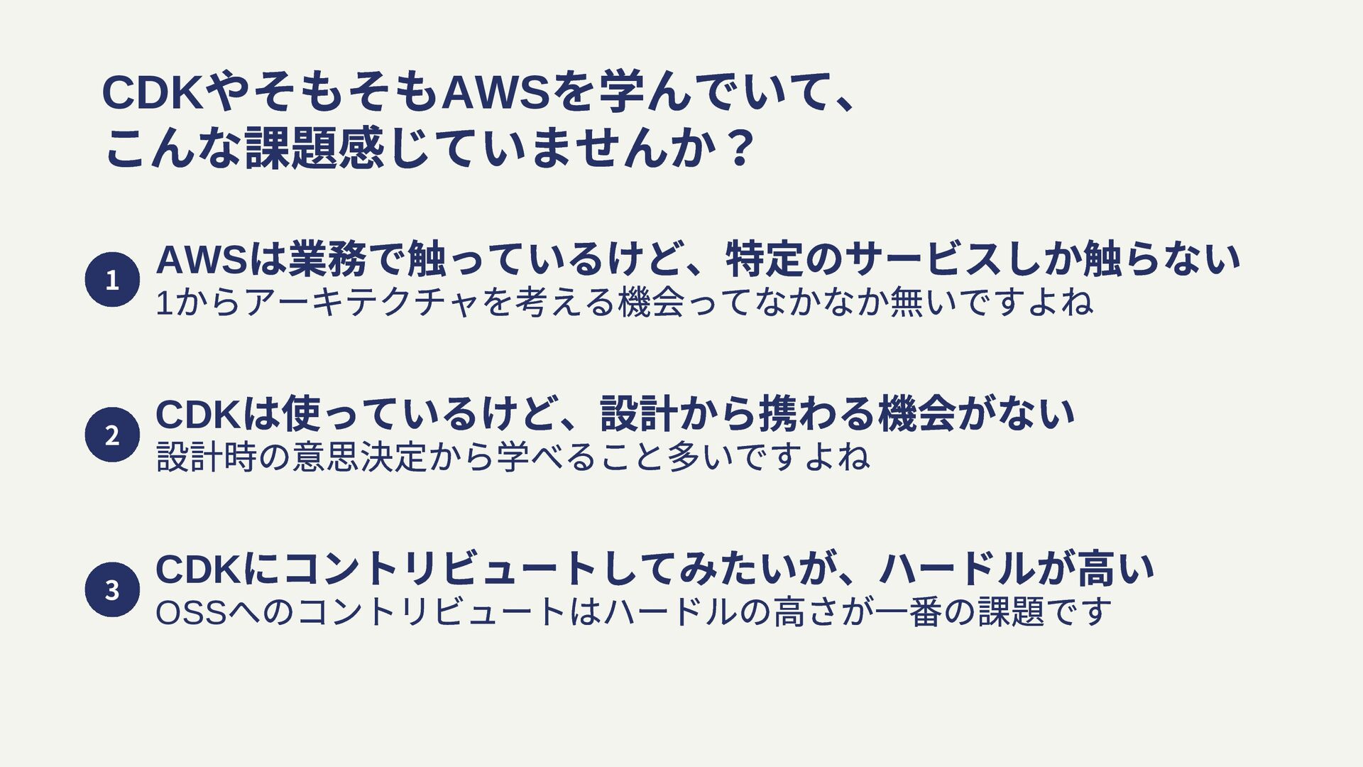 は使っているけど、設計から携わる機会がない 設計時の意思決定から学べること多いですよね CDK にコントリビュートしてみたいが、ハードルが高い OSS へのコントリビュートはハードルの高さが⼀番の課題です 2 3