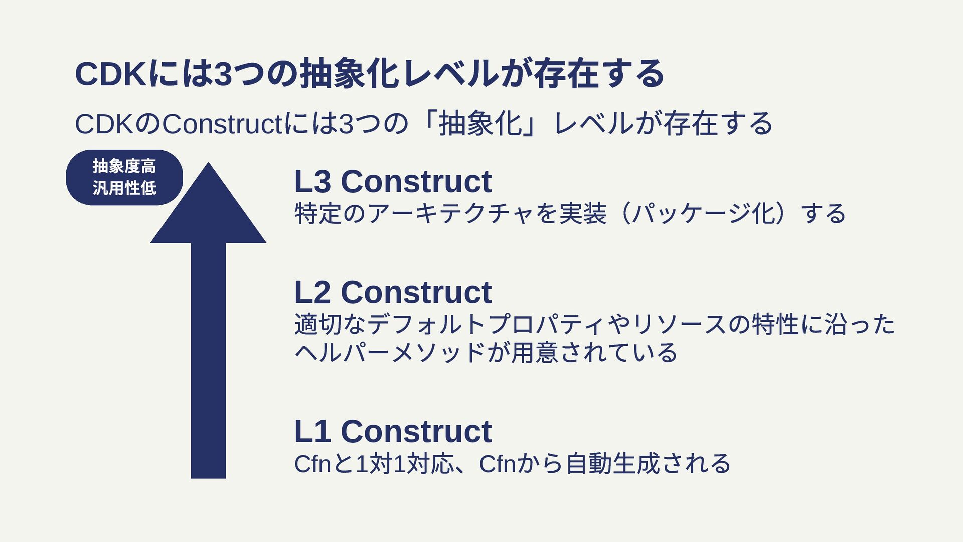 CDK には3 つの抽象化レベルが存在する CDK のConstruct には3 つの「抽象化」レベルが存在する L1 Construct Cfn