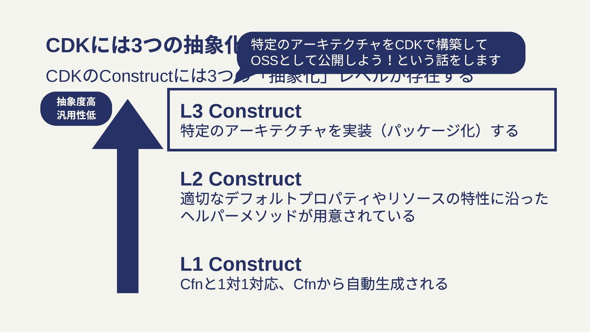 CDK には3 つの抽象化レベルが存在する CDK のConstruct には3 つの「抽象化」レベルが存在する L3 Construct 特定のアーキテクチャを実装(パッケージ化)する
