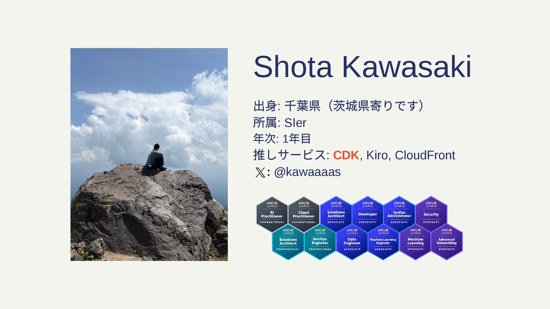 Shota Kawasaki 出身: 千葉県(茨城県寄りです) 所属: SIer 年次: 1 年目 推しサービス: