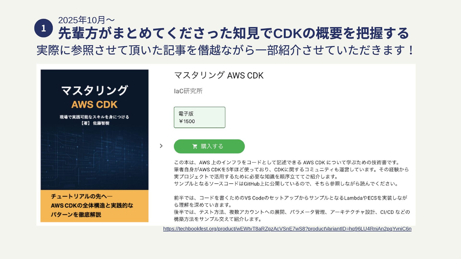 1 https://techbookfest.org/product/wEWtvT8aRZgzAcVSnE7wS8?productVariantID=hq96LU4RniAn2pqYvniC6n 2025 年10 月〜 先輩方がまとめてくださった知見でCDK の概要を把握する 実際に参照させて頂いた記事を僭越ながら一部紹介させていただきます!