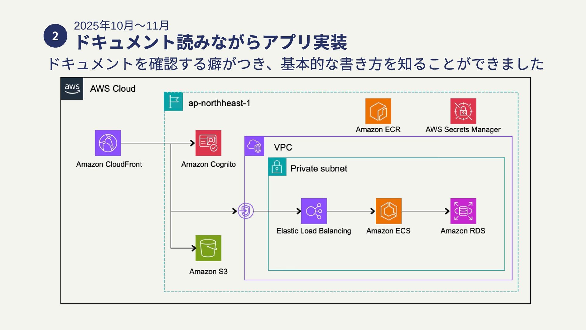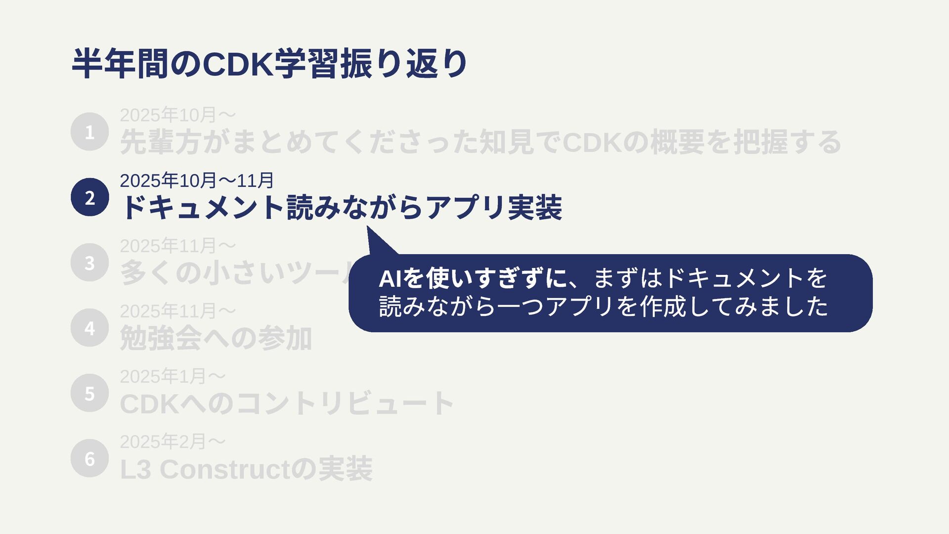 月〜11 ⽉ ドキュメント読みながらアプリ実装 2025 年11 月〜 多くの小さいツールや検証環境の実装 2 3 2025 年11 月〜 勉強会への参加 4 2025 年1 月〜 CDK へのコントリビュート 5 2025 年2 月〜 L3 Construct の実装 6 AI を使いすぎずに、まずはドキュメントを 読みながら一つアプリを作成してみました