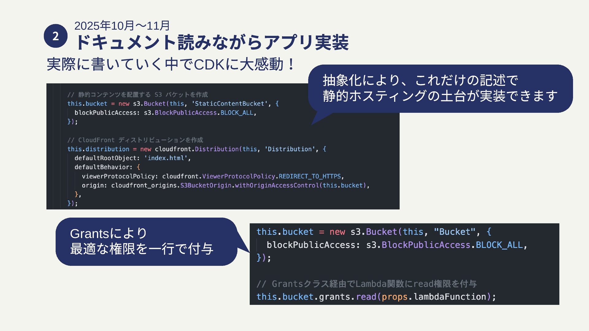 2 2025 年10 月〜11 ⽉ ドキュメント読みながらアプリ実装 実際に書いていく中でCDK に大感動! 抽象化により、これだけの記述で 静的ホスティングの土台が実装できます