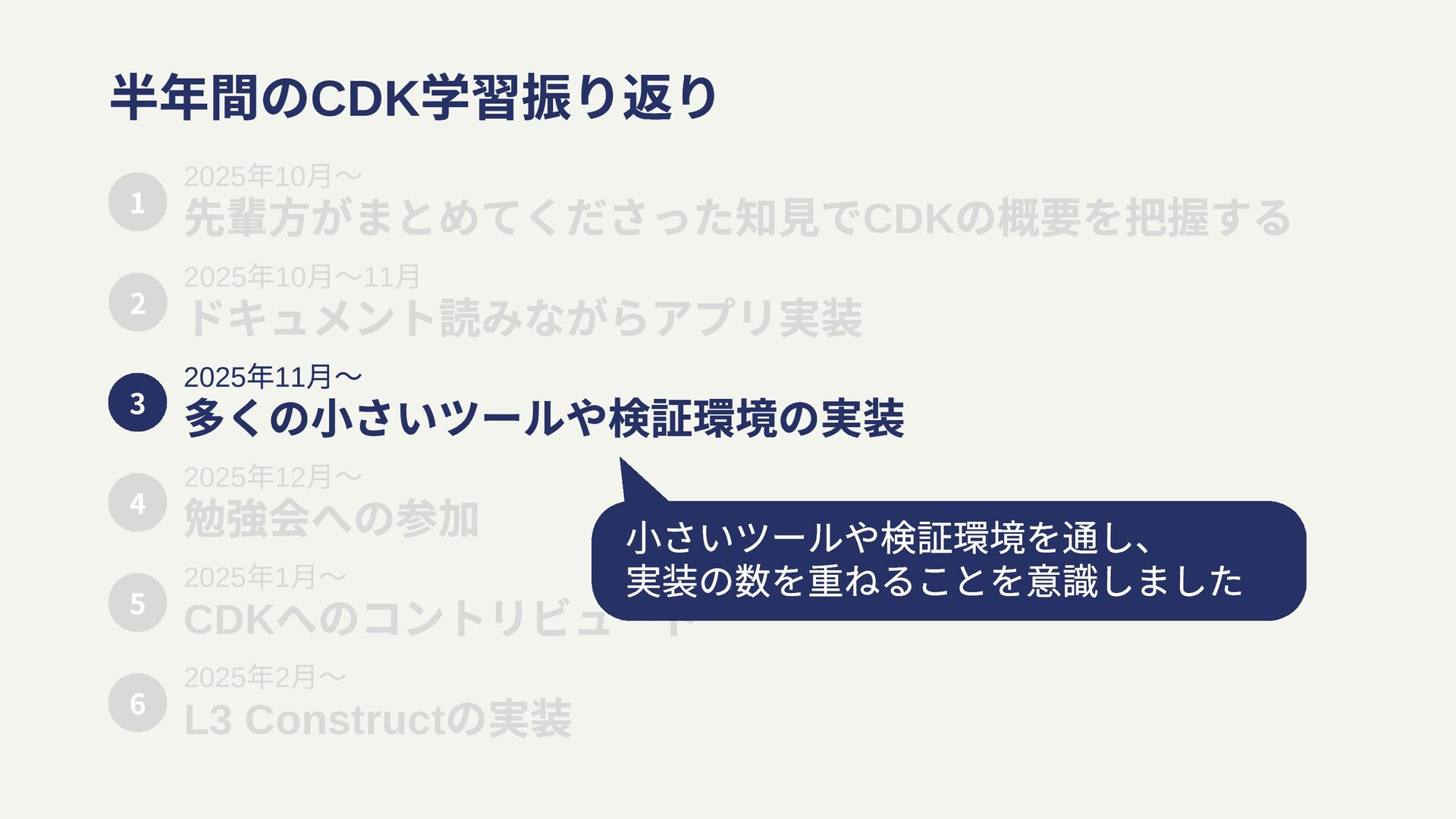 月〜11 ⽉ ドキュメント読みながらアプリ実装 2025 年11 月〜 多くの小さいツールや検証環境の実装 2 3 2025 年12 月〜 勉強会への参加 4 2025 年1 月〜 CDK へのコントリビュート 5 2025 年2 月〜 L3 Construct の実装 6 小さいツールや検証環境を通し、 実装の数を重ねることを意識しました