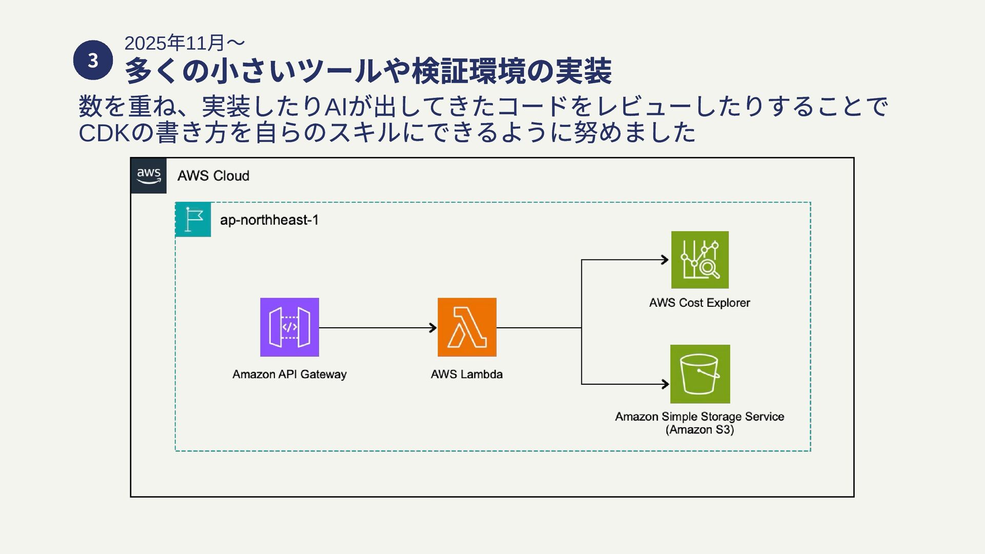 3 2025 年11 月〜 多くの小さいツールや検証環境の実装 数を重ね、実装したりAI が出してきたコードをレビューしたりすることで CDK の書き方を自らのスキルにできるように努めました