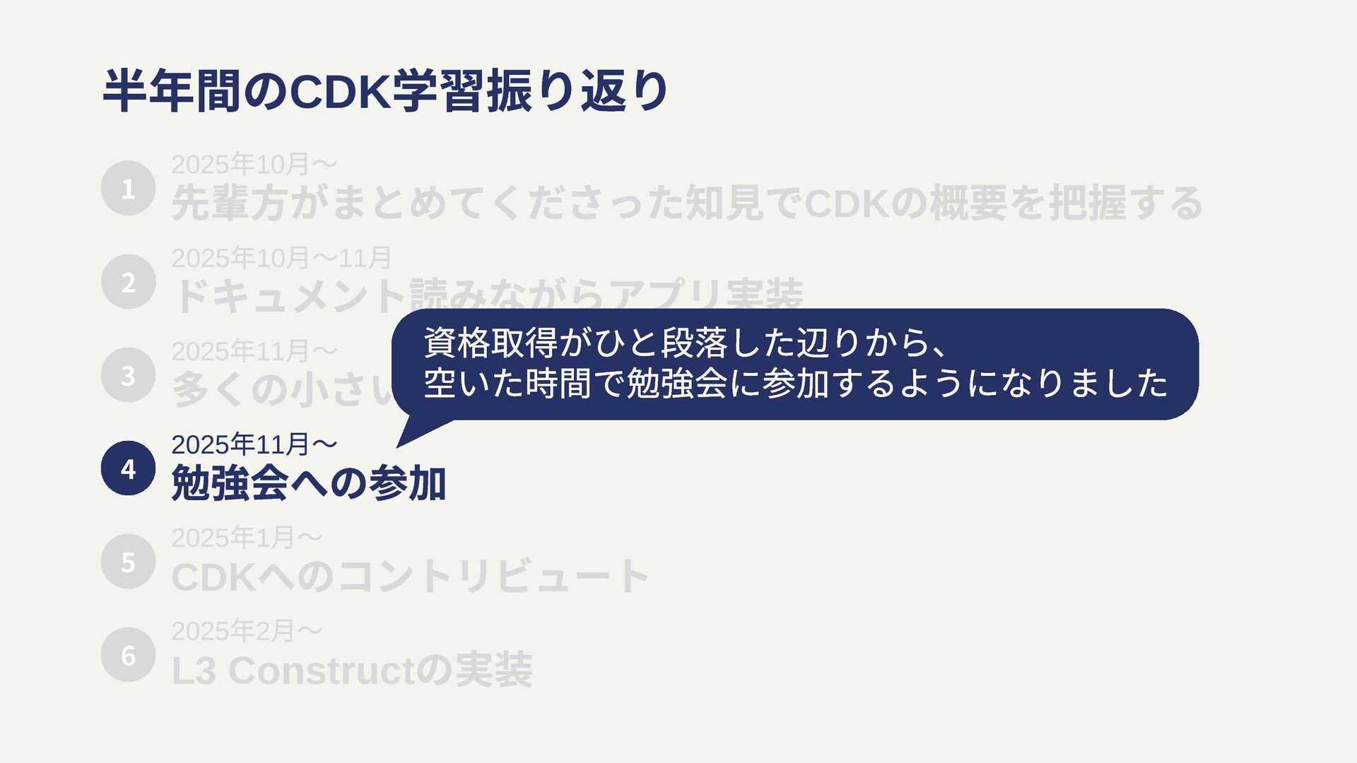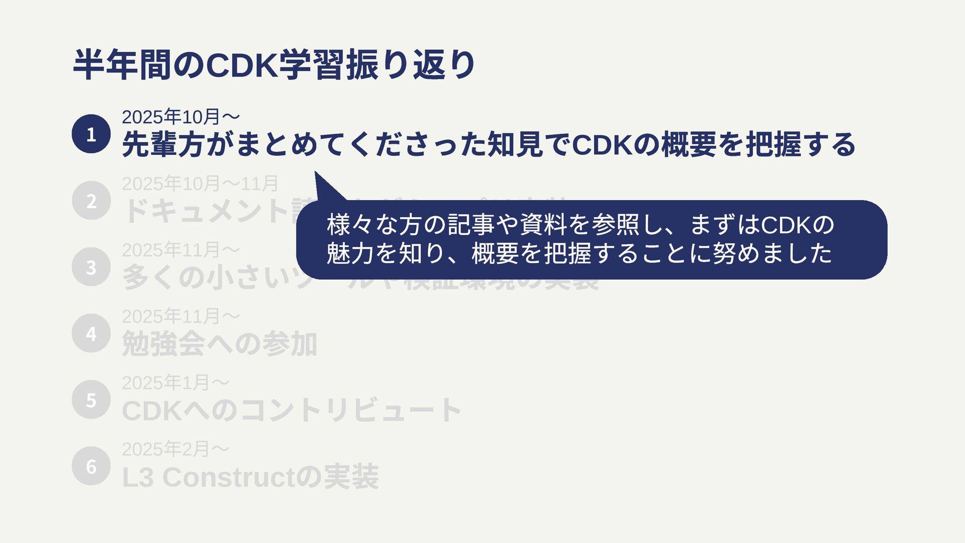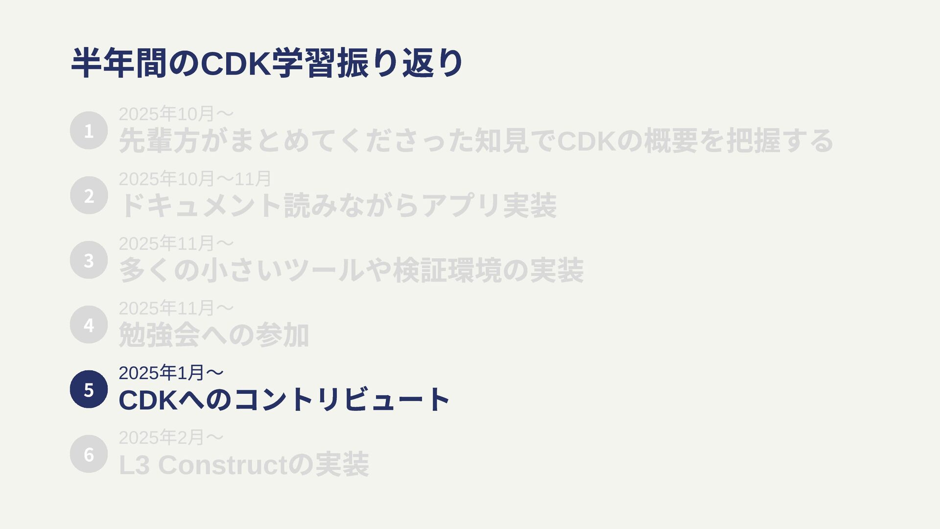 月〜11 ⽉ ドキュメント読みながらアプリ実装 2025 年11 月〜 多くの小さいツールや検証環境の実装 2 3 2025 年11 月〜 勉強会への参加 4 2025 年1 月〜 CDK へのコントリビュート 5 2025 年2 月〜 L3 Construct の実装 6