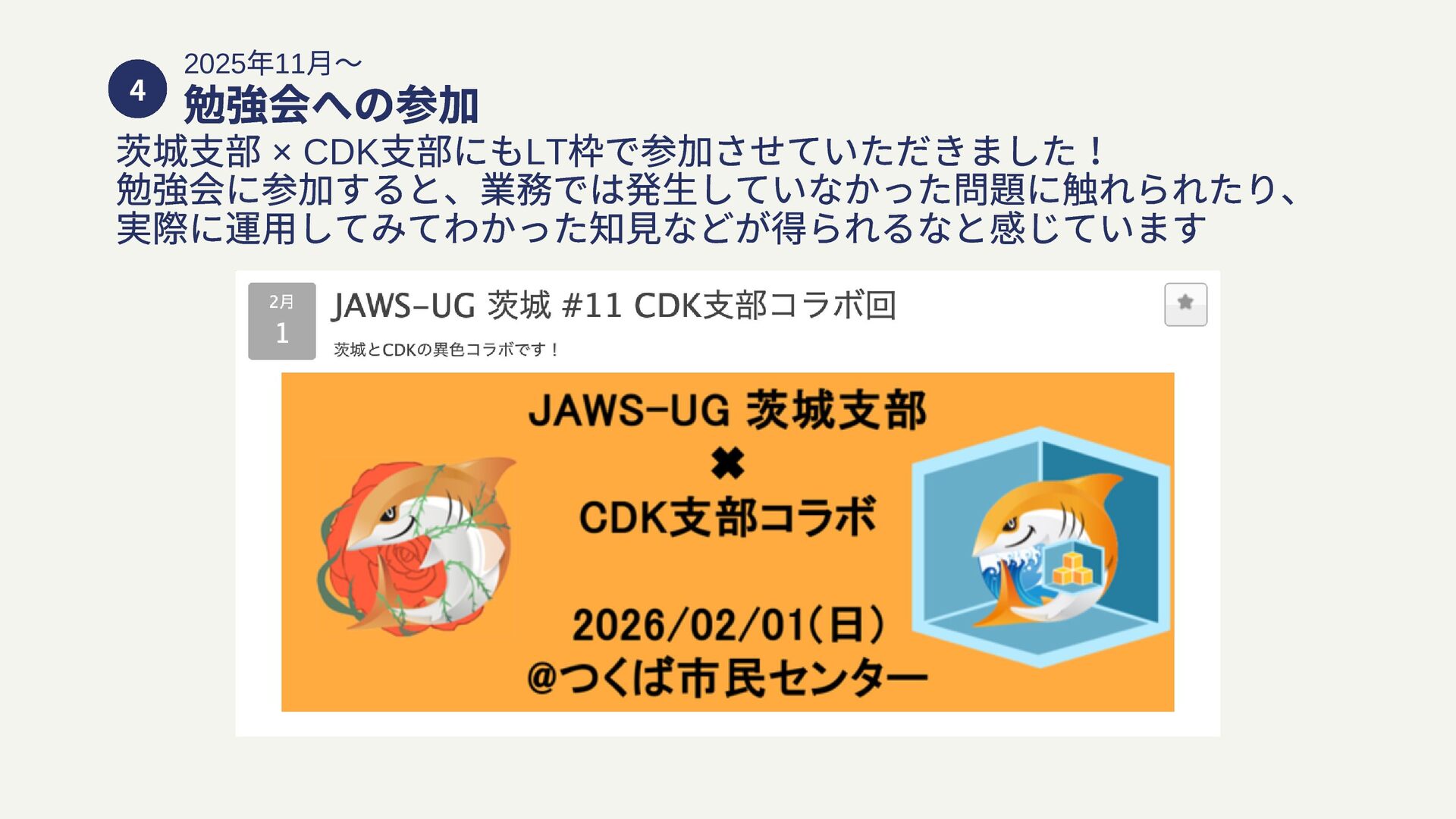 4 2025 年11 月〜 勉強会への参加 茨城支部 × CDK 支部にもLT 枠で参加させていただきました!