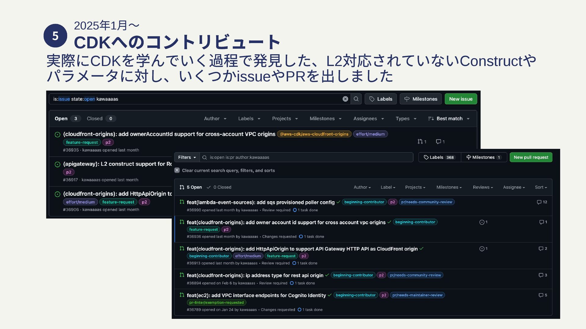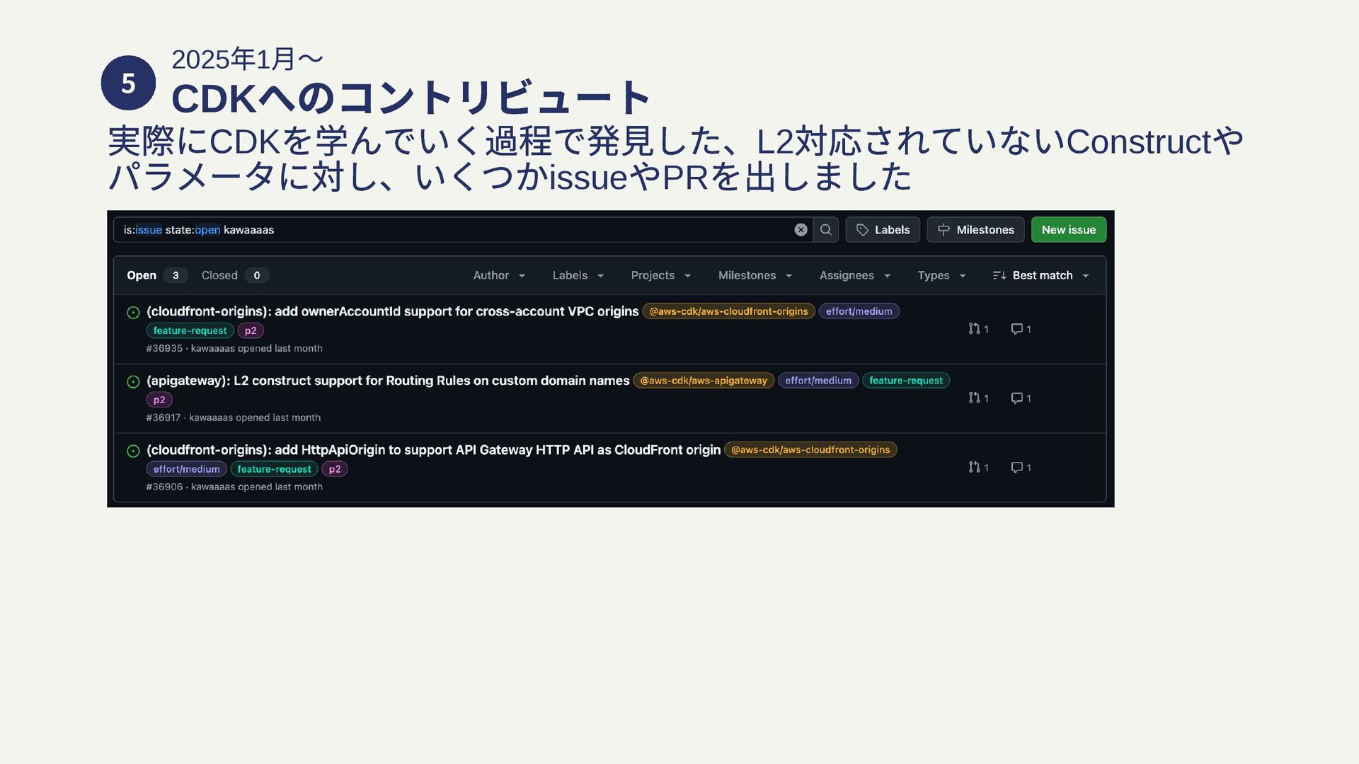 5 2025 年1 月〜 CDK へのコントリビュート 実際にCDK を学んでいく過程で発見した、L2 対応されていないConstruct や