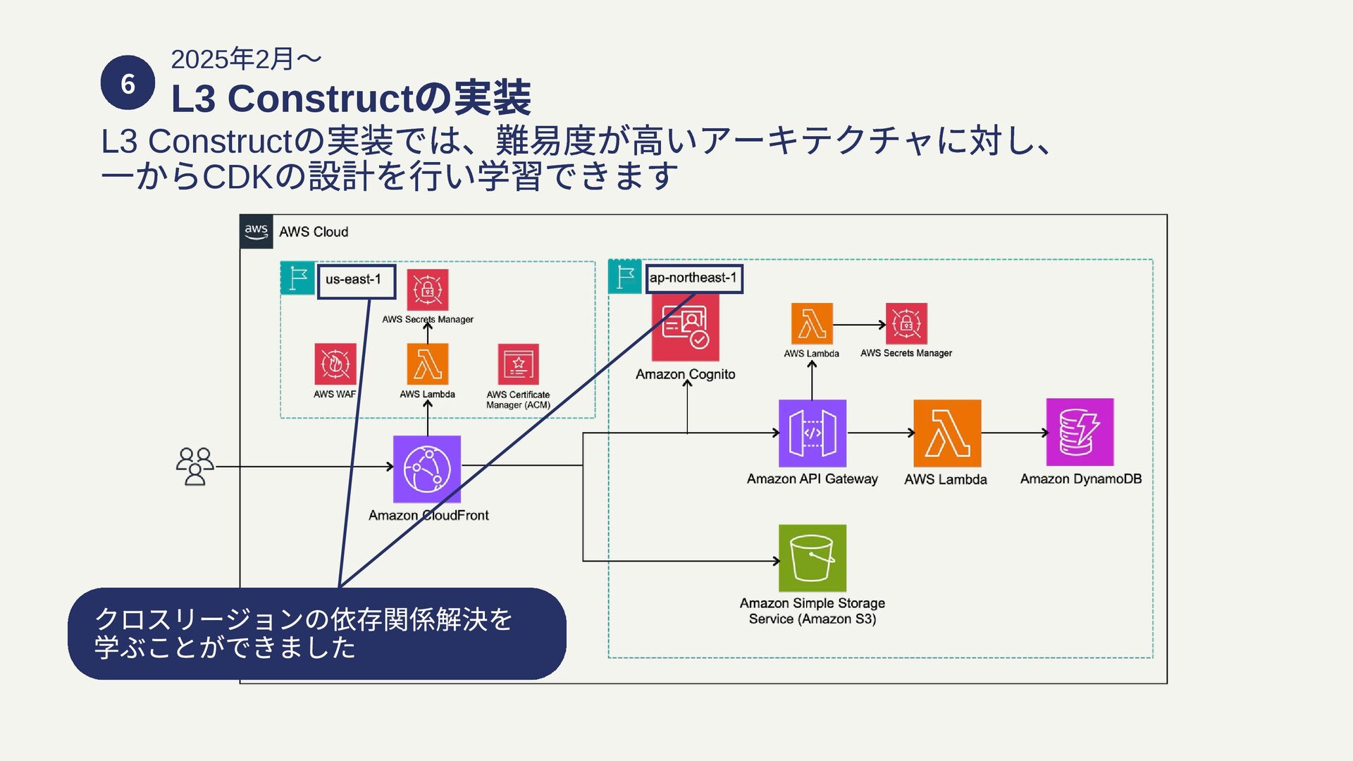 一からCDK の設計を⾏い学習できます クロスリージョンの依存関係解決を 学ぶことができました