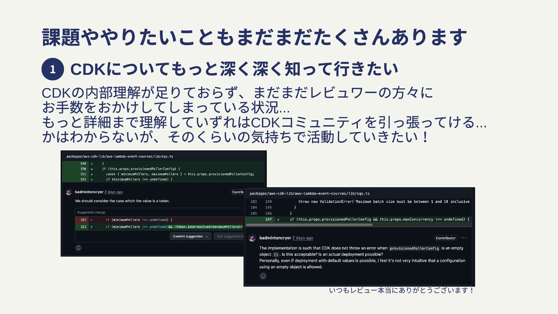 1 課題ややりたいこともまだまだたくさんあります CDK についてもっと深く深く知って行きたい CDK の内部理解が足りておらず、まだまだレビュワーの方々に お手数をおかけしてしまっている状況... もっと詳細まで理解していずれはCDK コミュニティを引っ張ってける... かはわからないが、そのくらいの気持ちで活動していきたい!