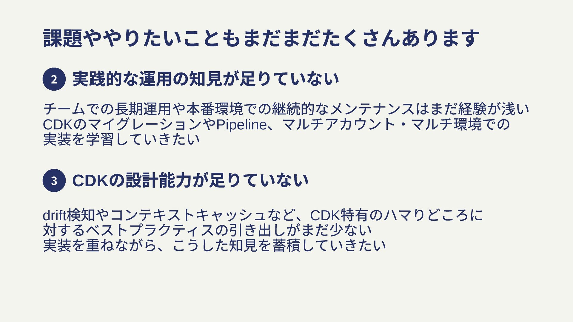 課題ややりたいこともまだまだたくさんあります drift 検知やコンテキストキャッシュなど、CDK 特有のハマりどころに 対するベストプラクティスの引き出しがまだ少ない 実装を重ねながら、こうした知見を蓄積していきたい