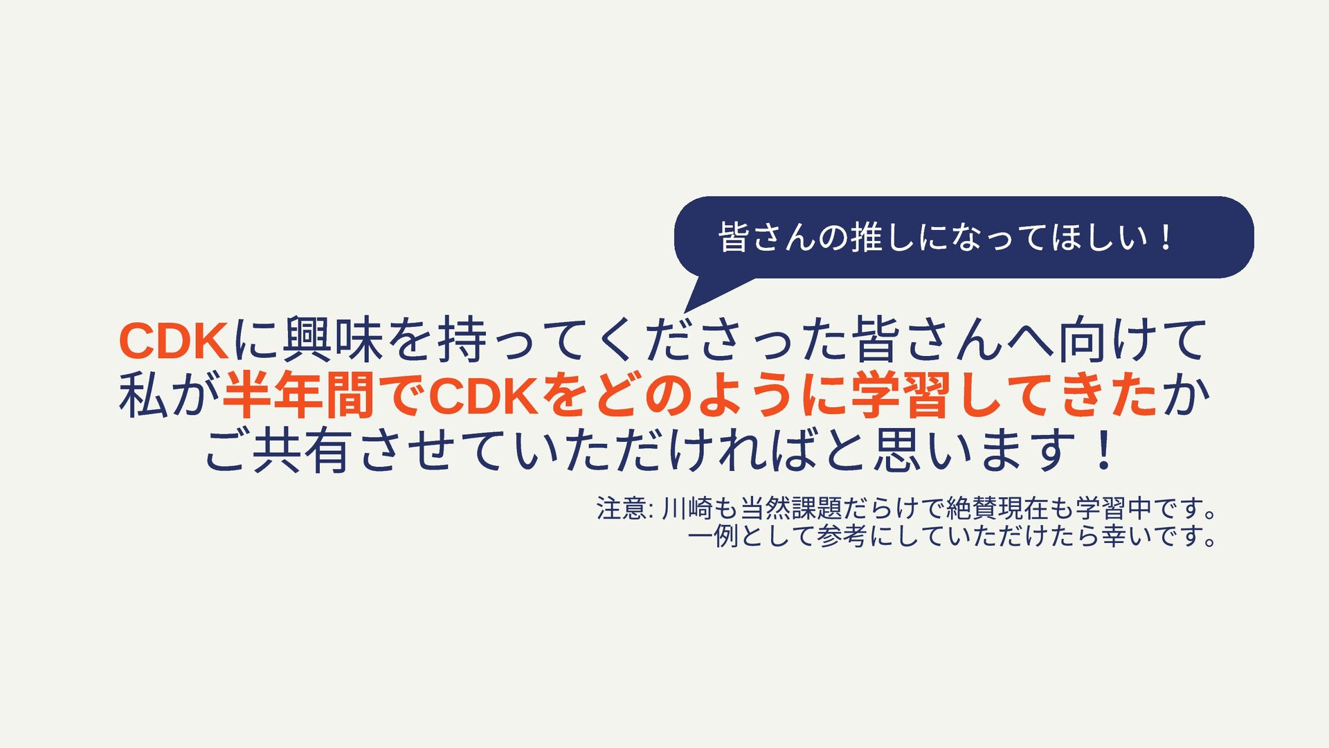 CDK に興味を持ってくださった皆さんへ向けて 私が半年間でCDK をどのように学習してきたか ご共有させていただければと思います! 皆さんの推しになってほしい! 注意: 川崎も当然課題だらけで絶賛現在も学習中です。 一例として参考にしていただけたら幸いです。