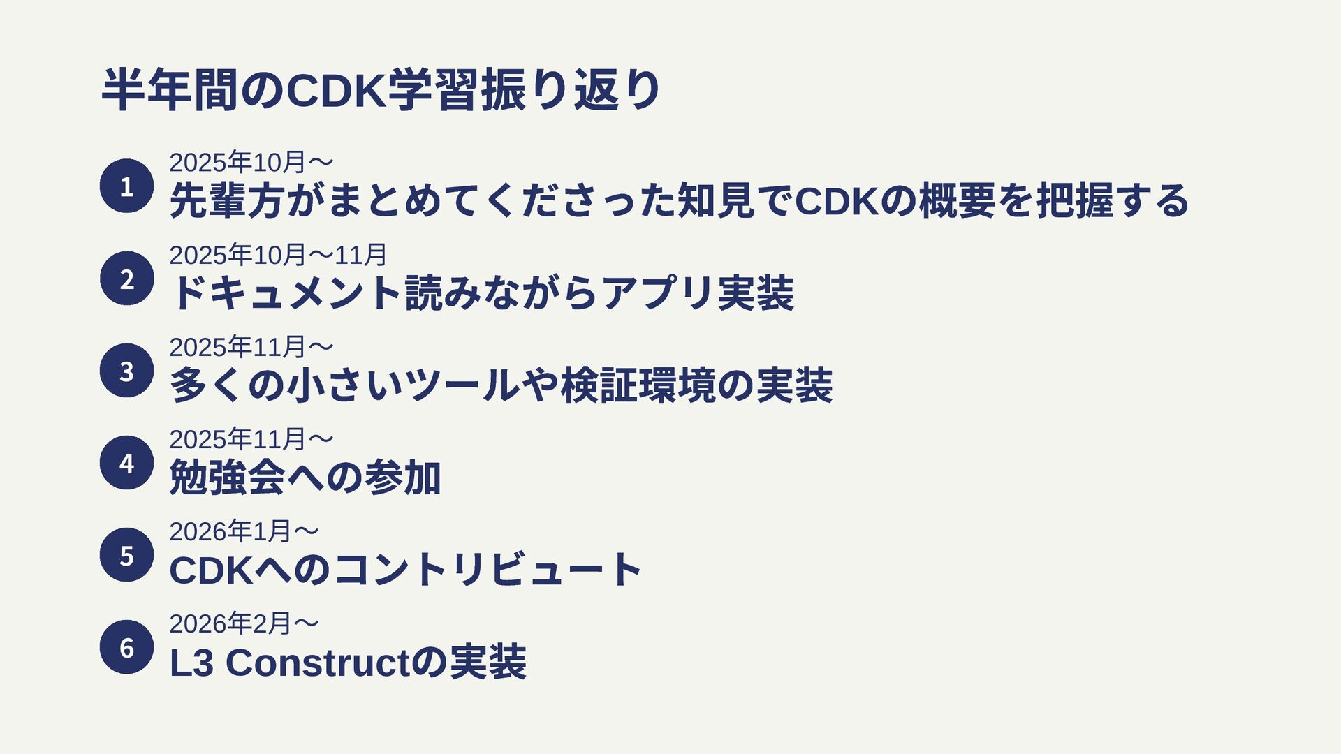月〜11 ⽉ ドキュメント読みながらアプリ実装 2025 年11 月〜 多くの小さいツールや検証環境の実装 2 3 2025 年11 月〜 勉強会への参加 4 2026 年1 月〜 CDK へのコントリビュート 5 2026 年2 月〜 L3 Construct の実装 6