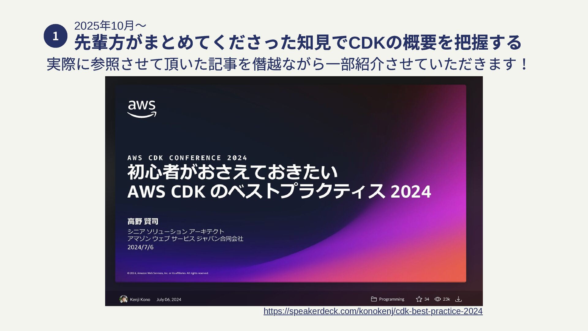 1 2025 年10 月〜 先輩方がまとめてくださった知見でCDK の概要を把握する https://speakerdeck.com/konokenj/cdk-best-practice-2024 実際に参照させて頂いた記事を僭越ながら一部紹介させていただきます!